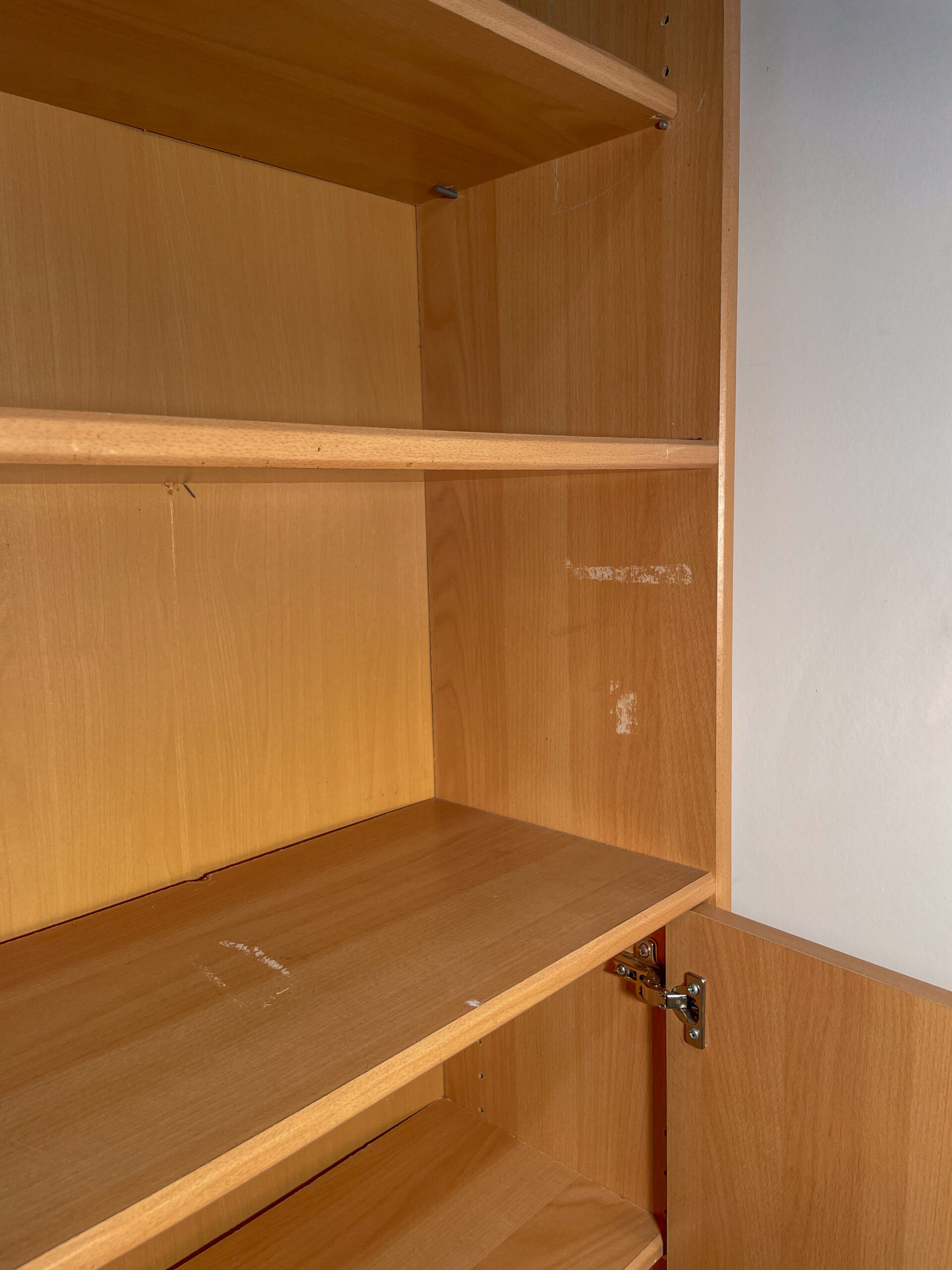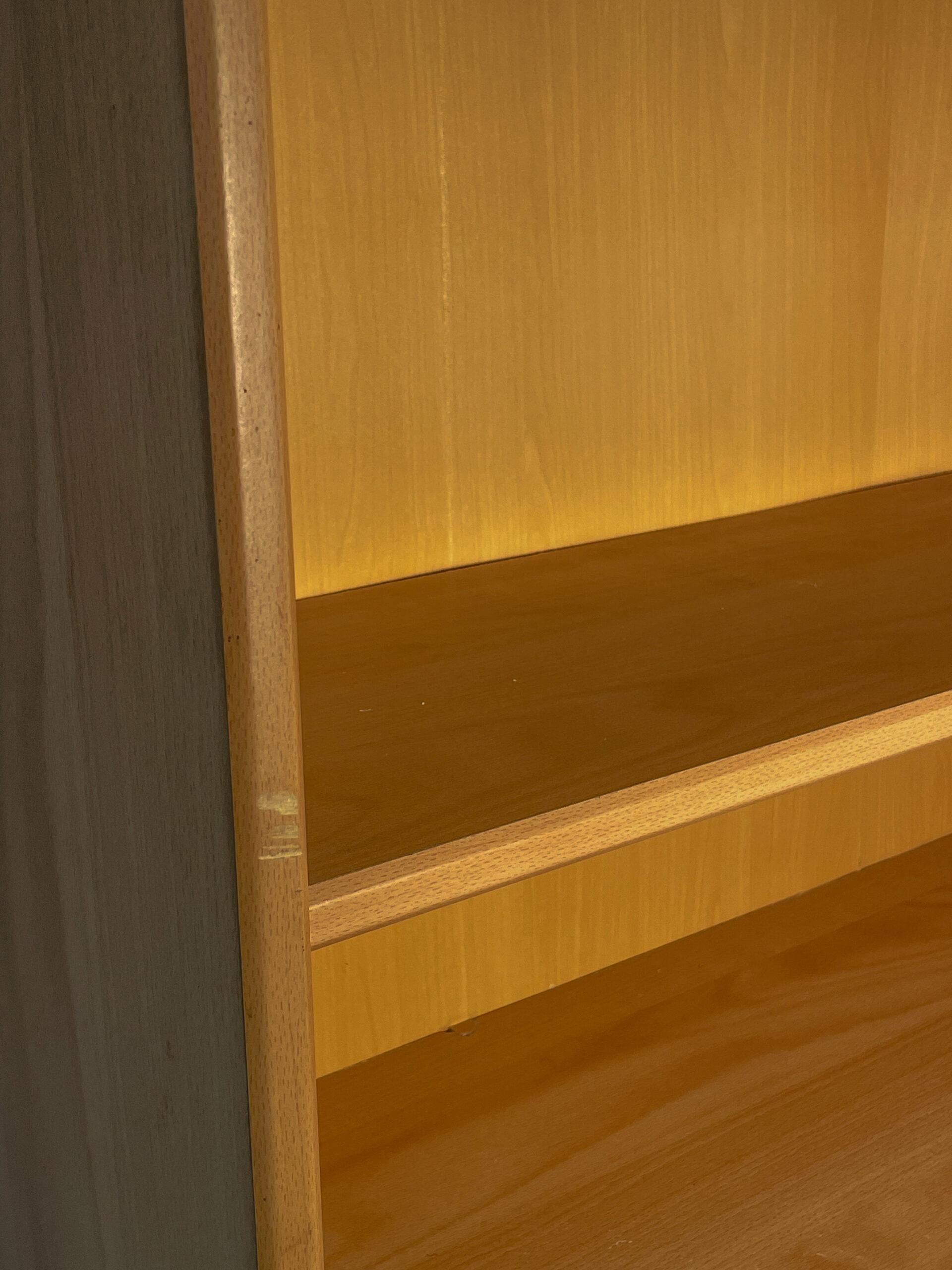 Bibliothèque en bois clair/doré avec une partie basse en placard.