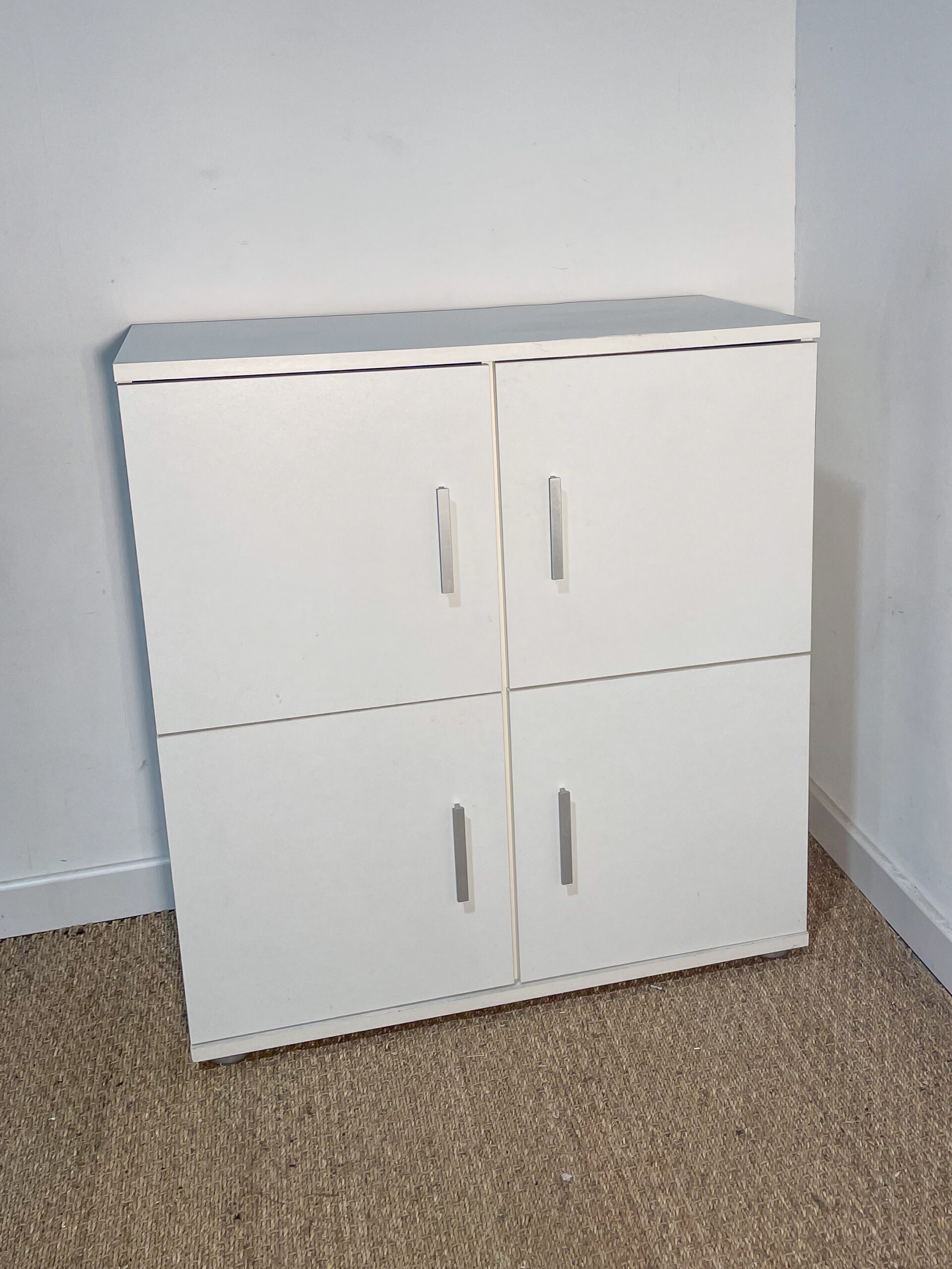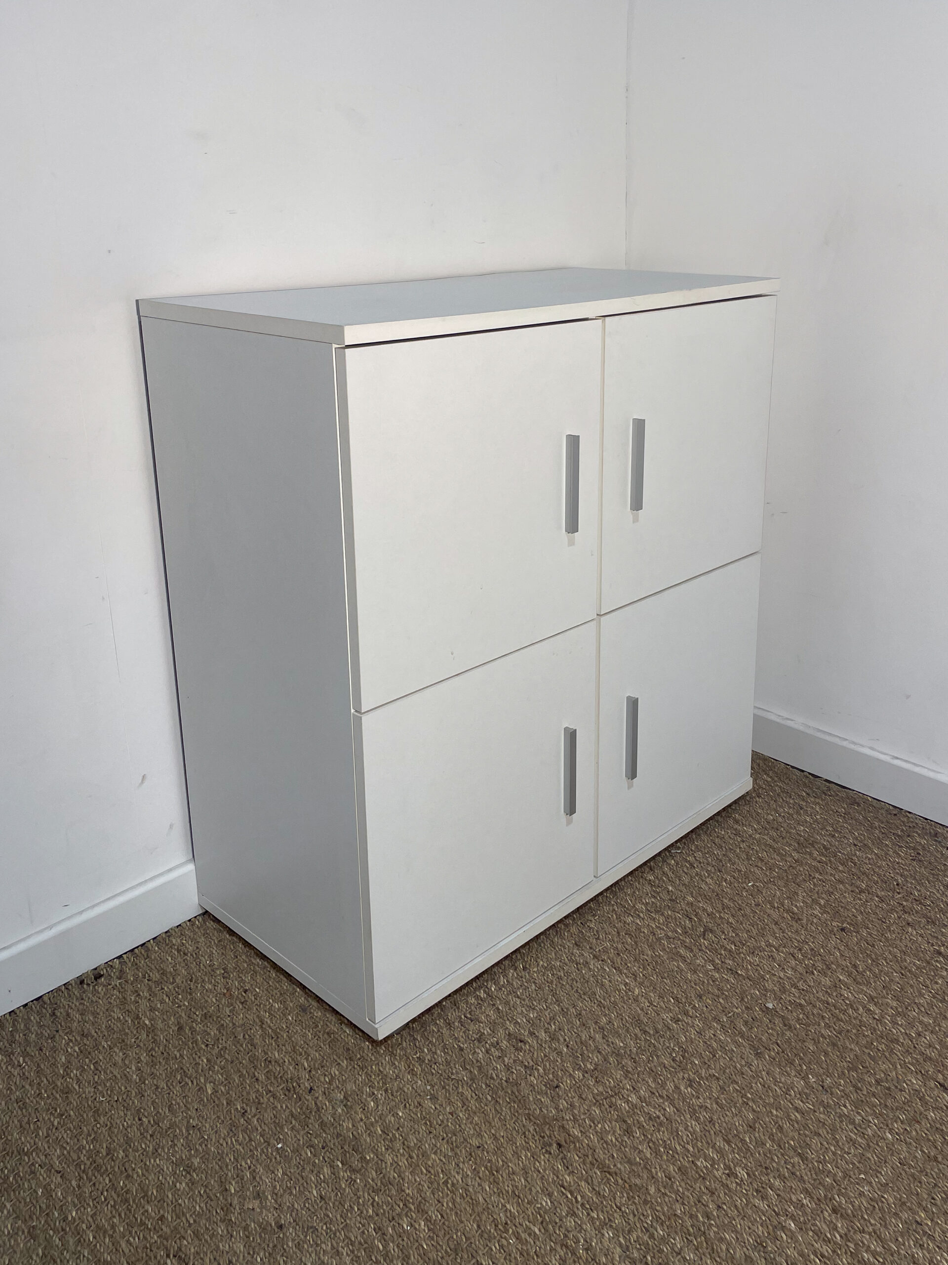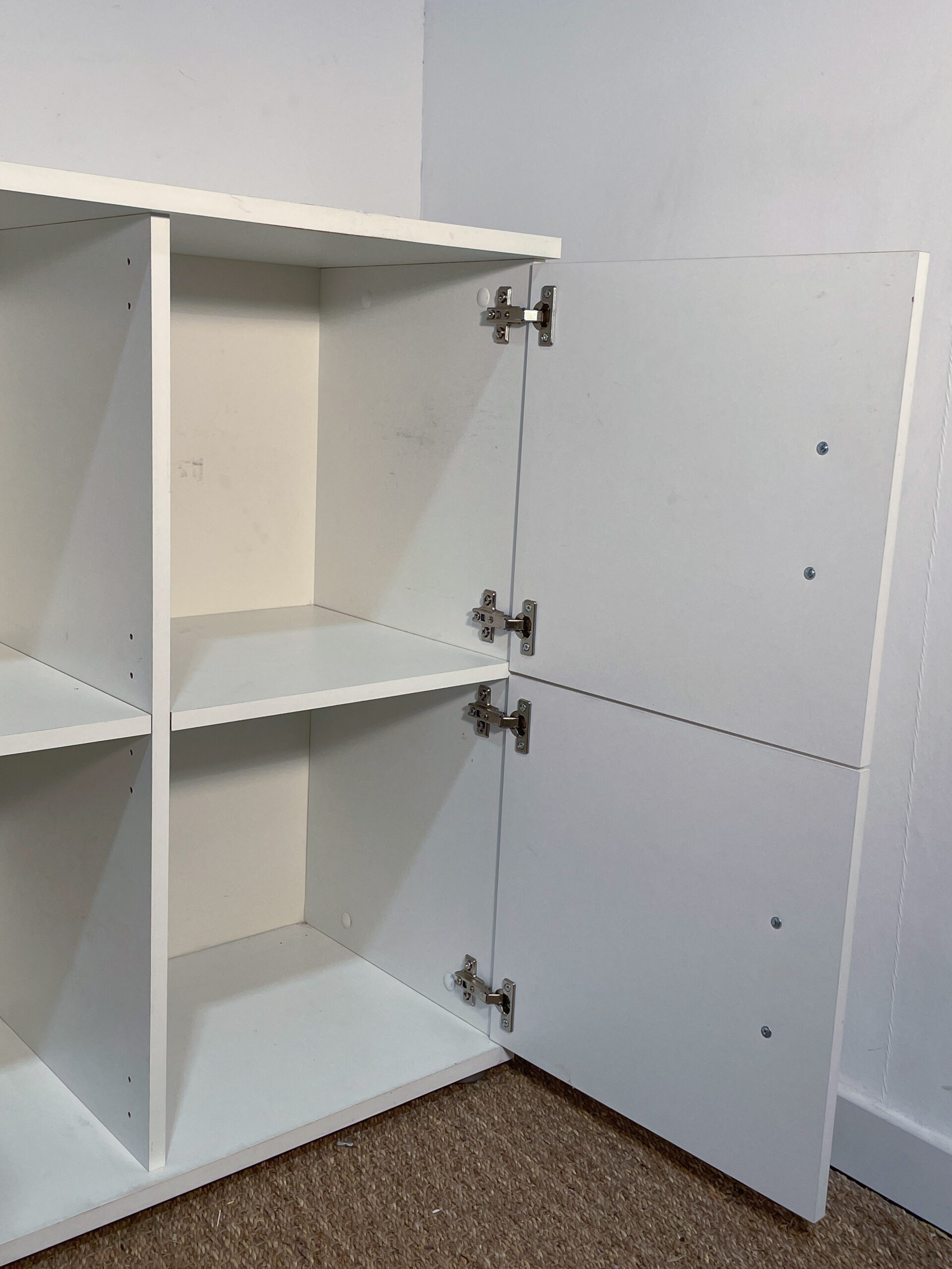 Buffet carré en bois blanc avec 4 compartiments carrés à portes.