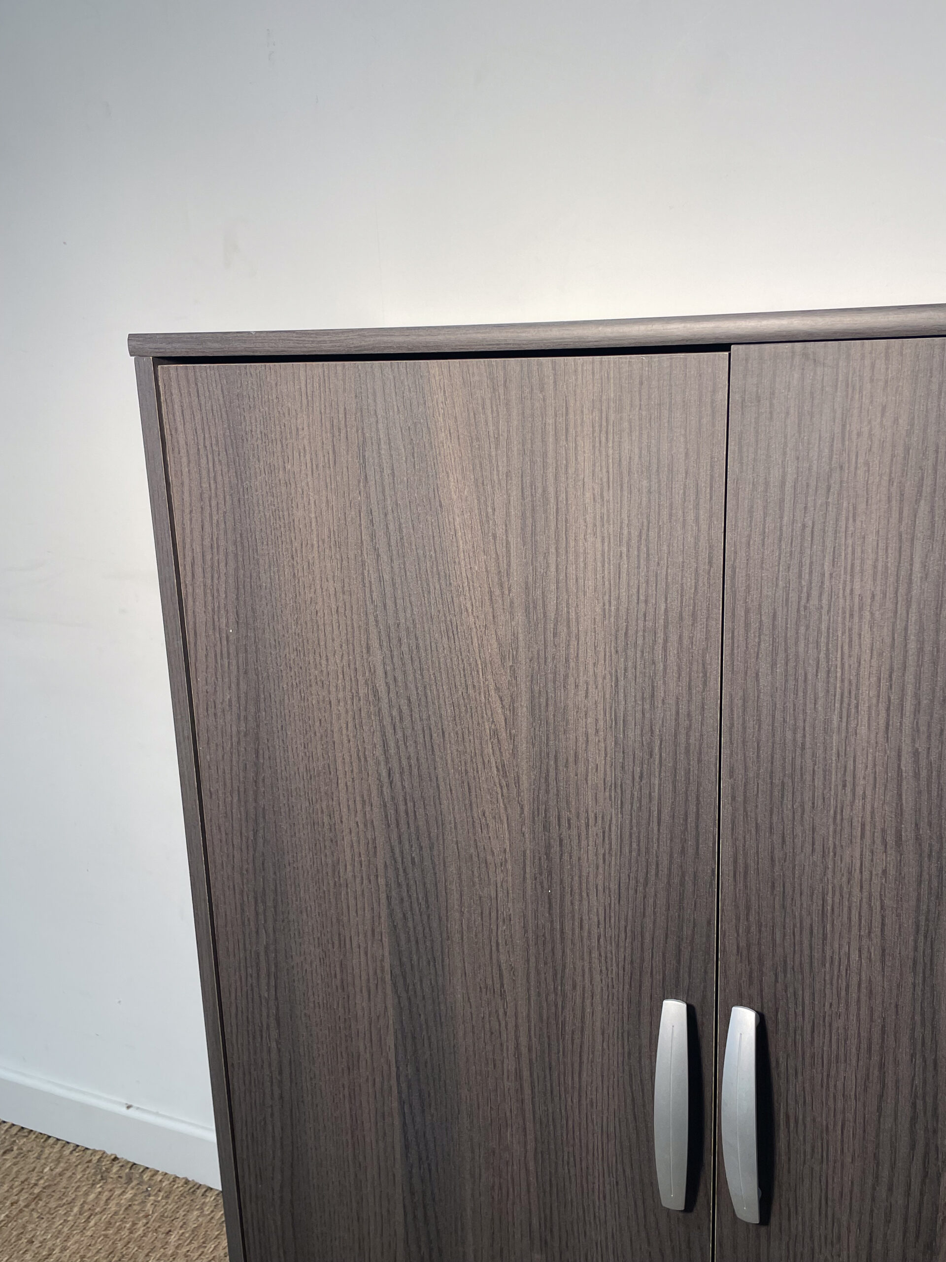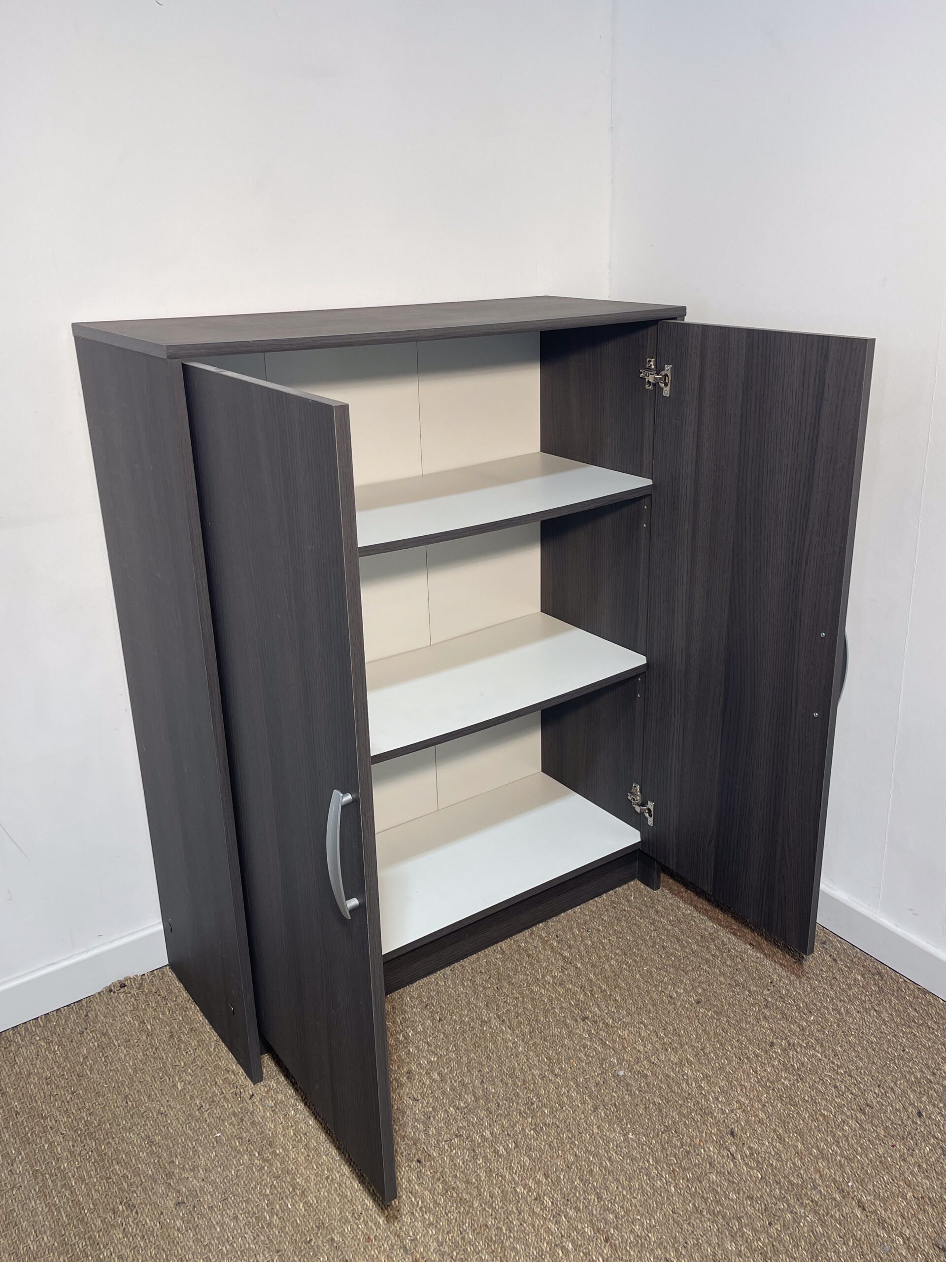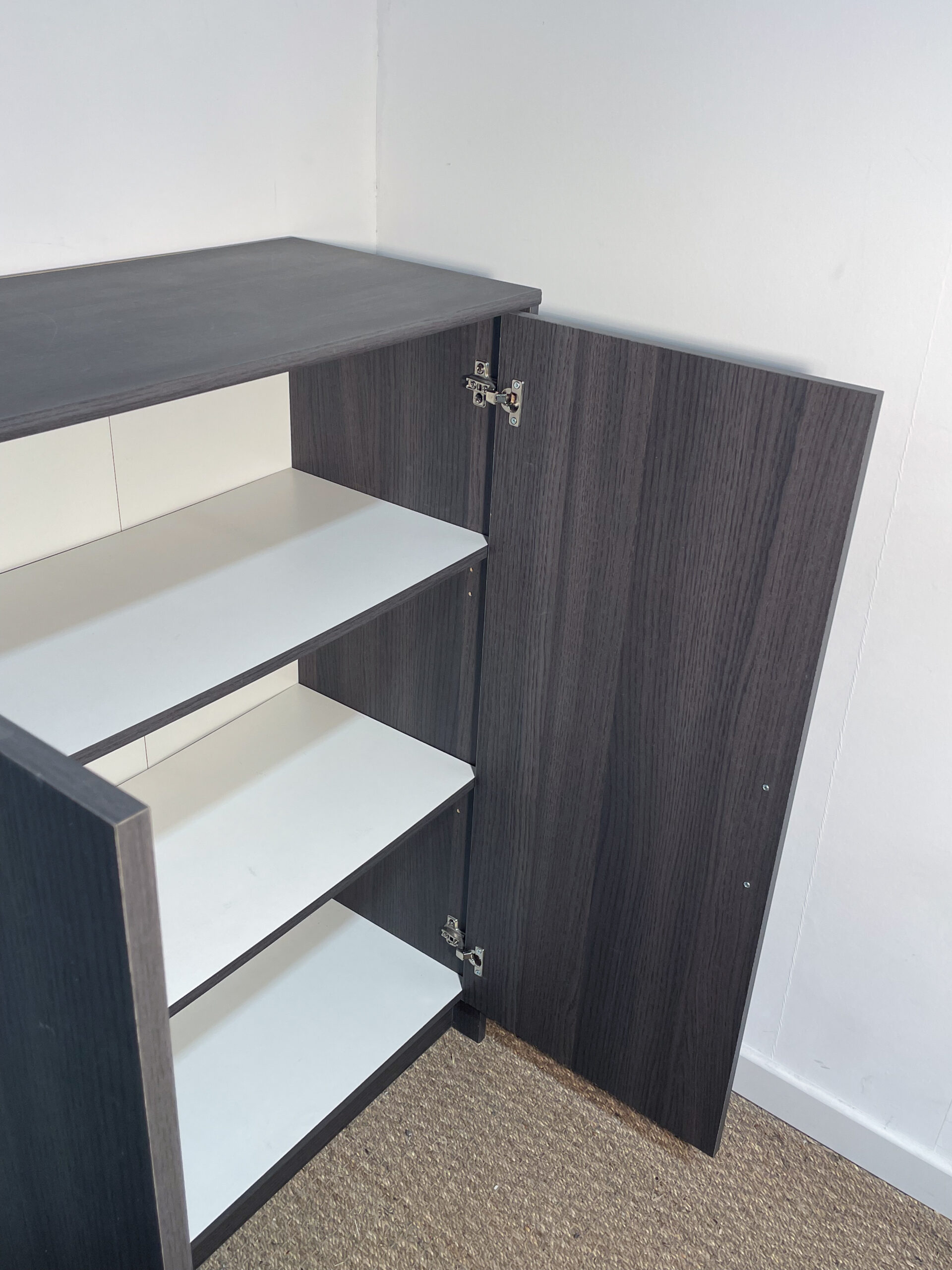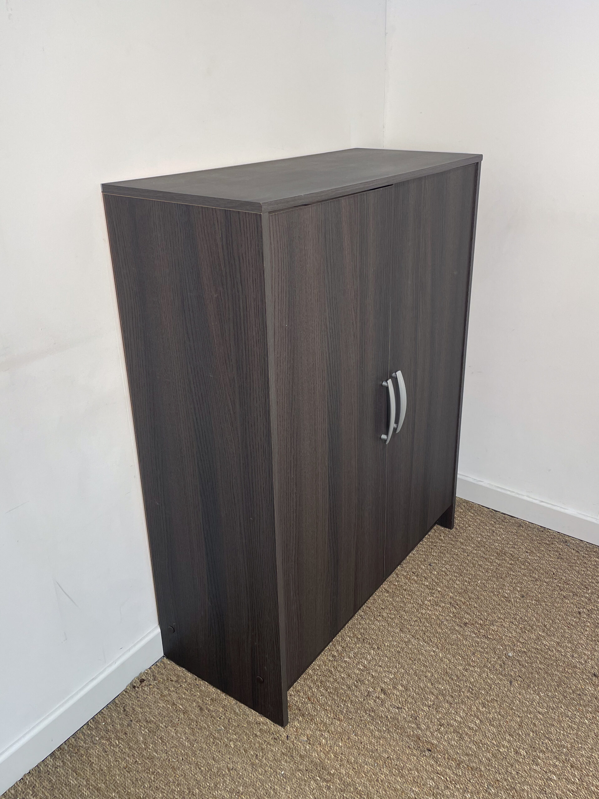 Buffet en bois très foncé, avec 2 portes et 3 niveaux de rangement.