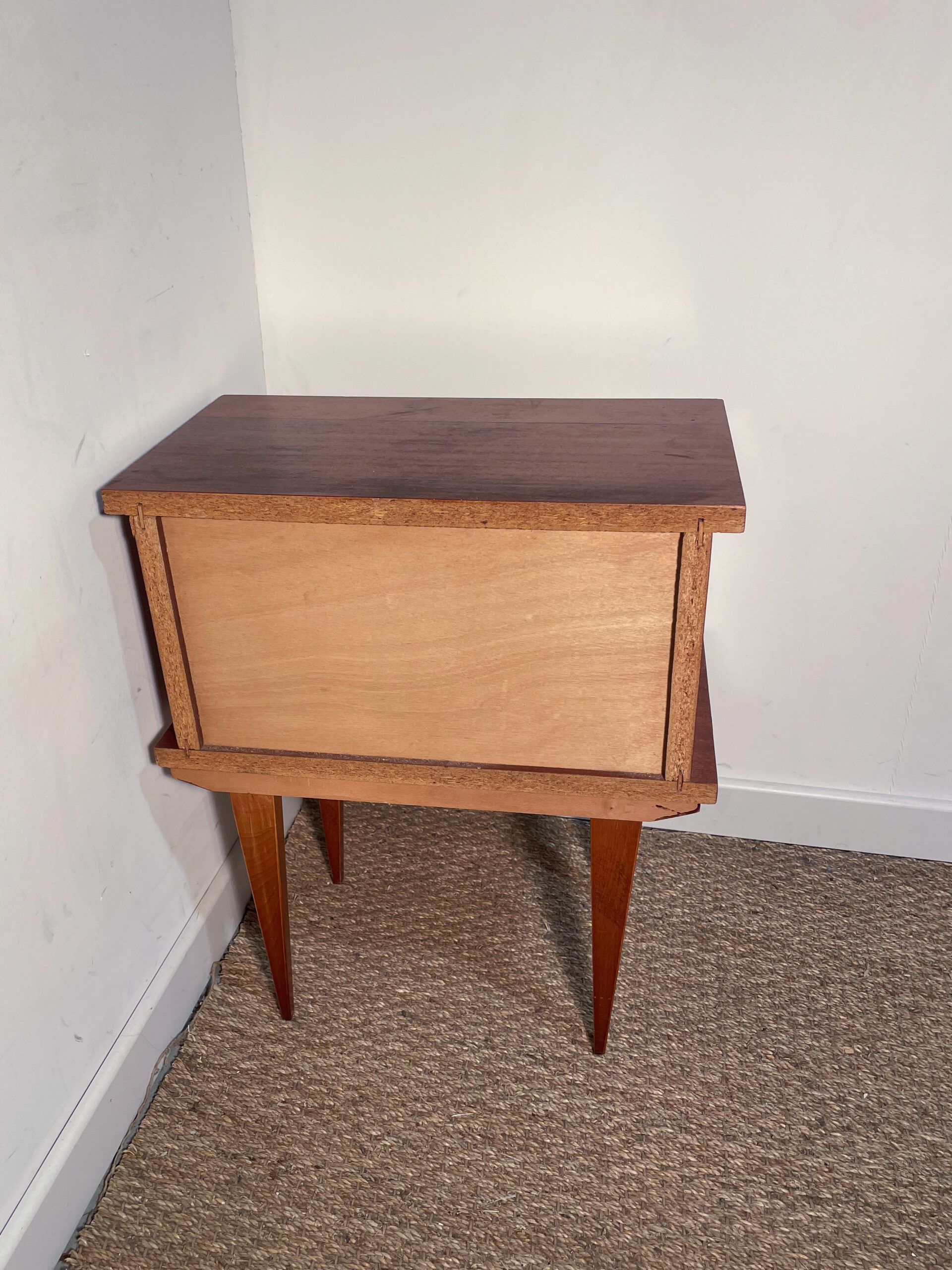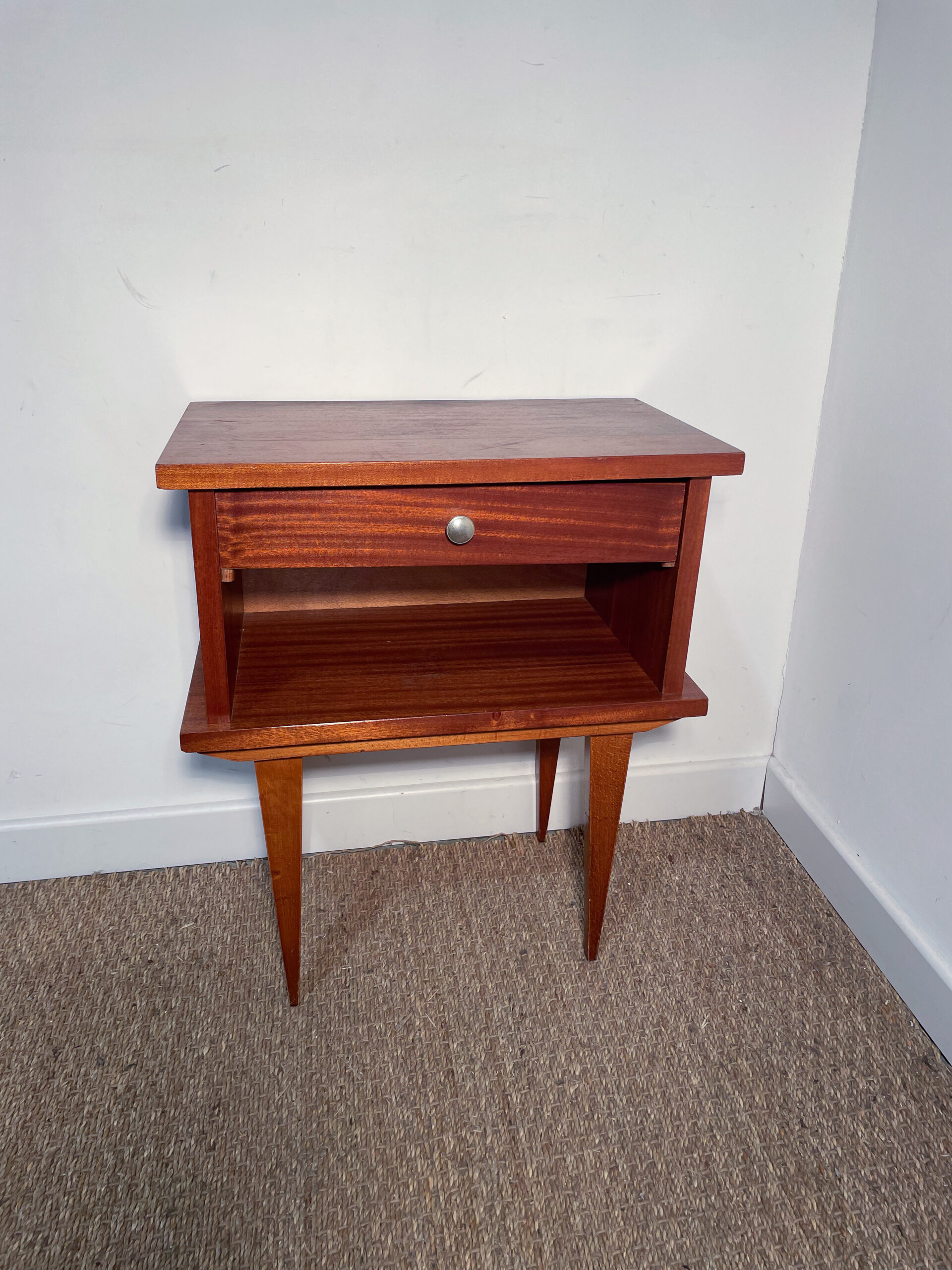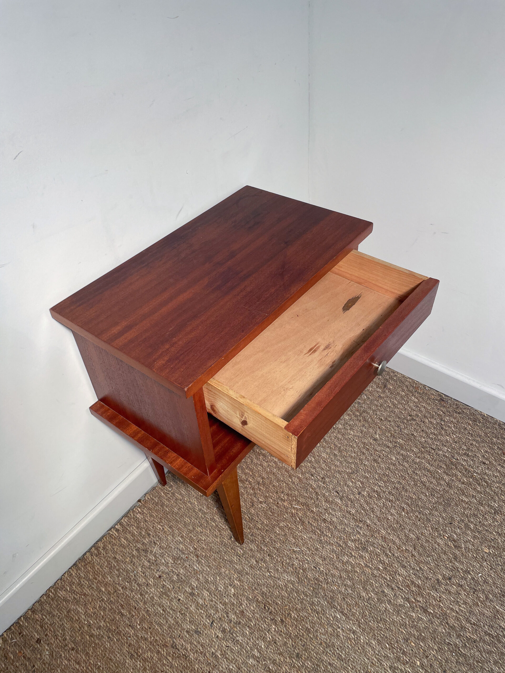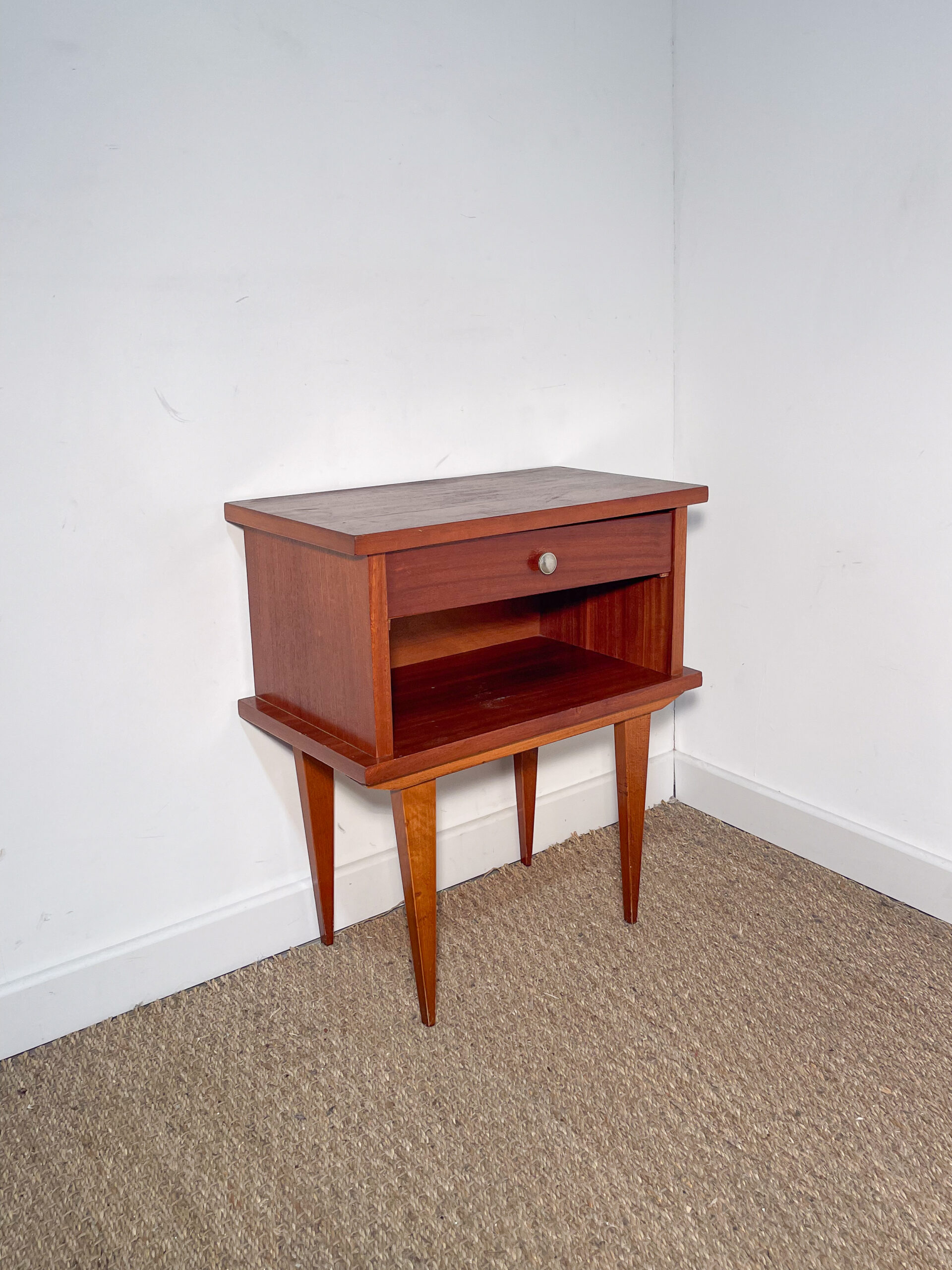Petite table de chevet haute en bois foncé, avec un tiroir et un rangement ouvert.