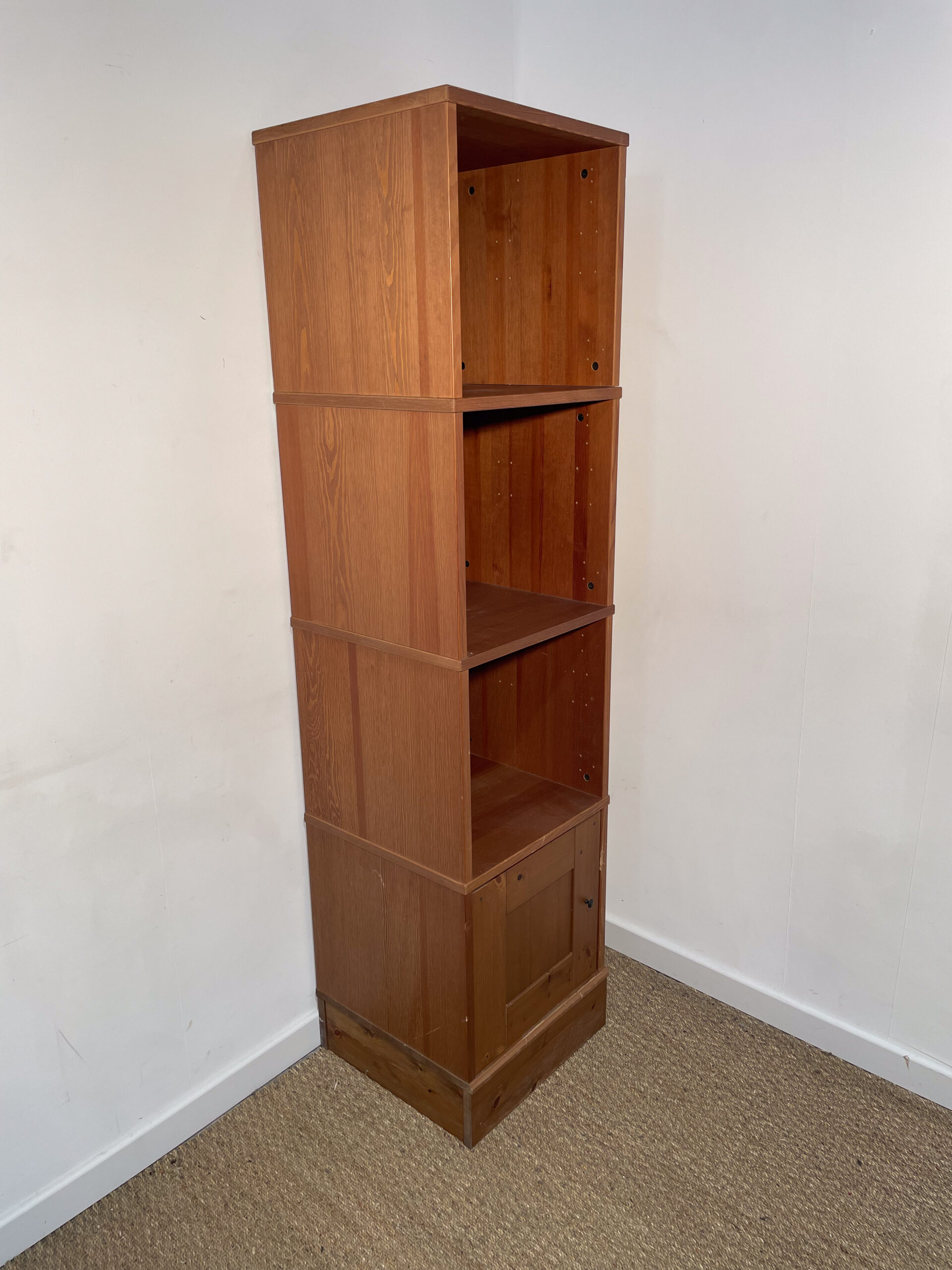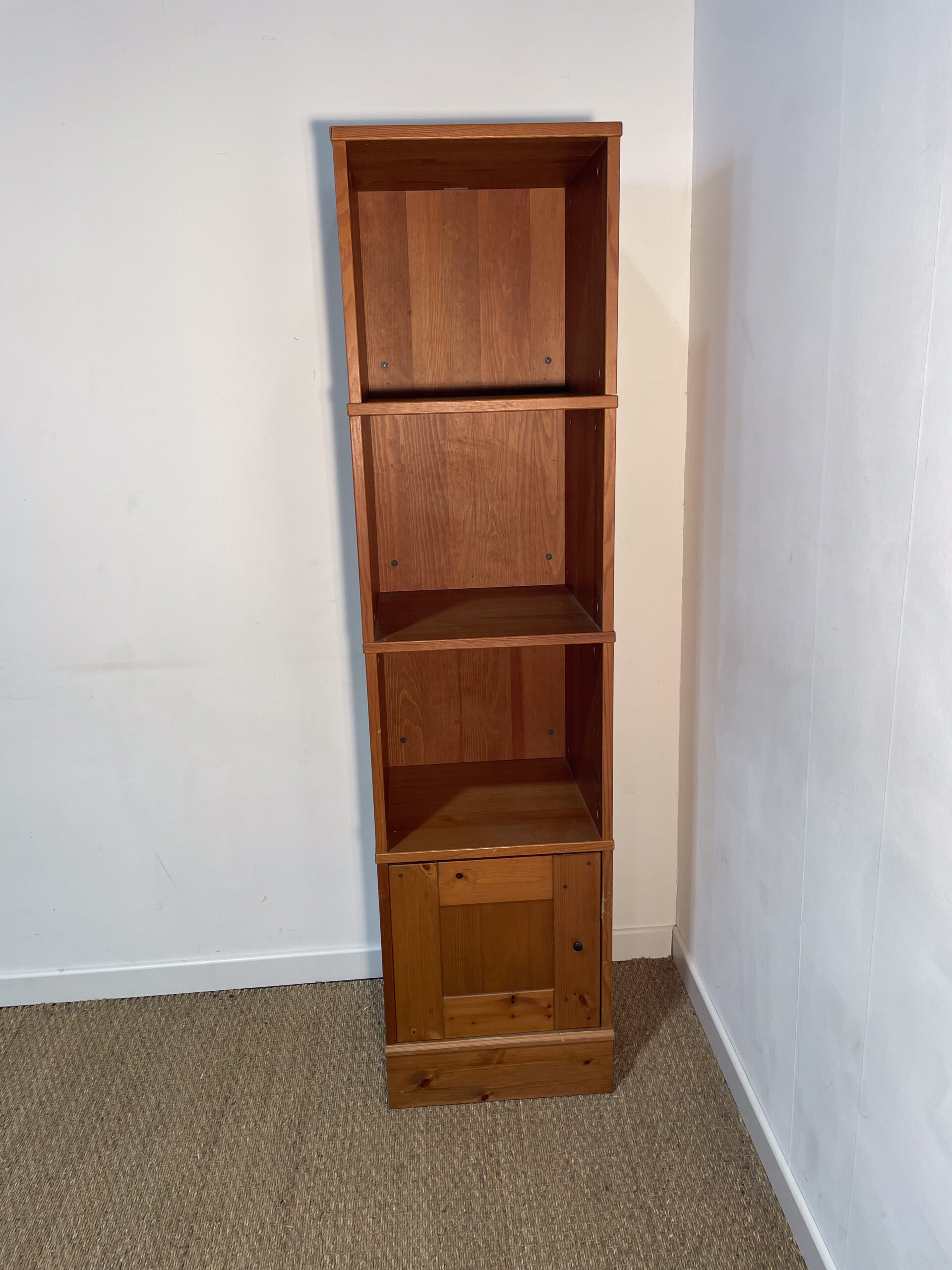 Colonne étagère haute en bois foncé, dont 2 caissons avec portes.