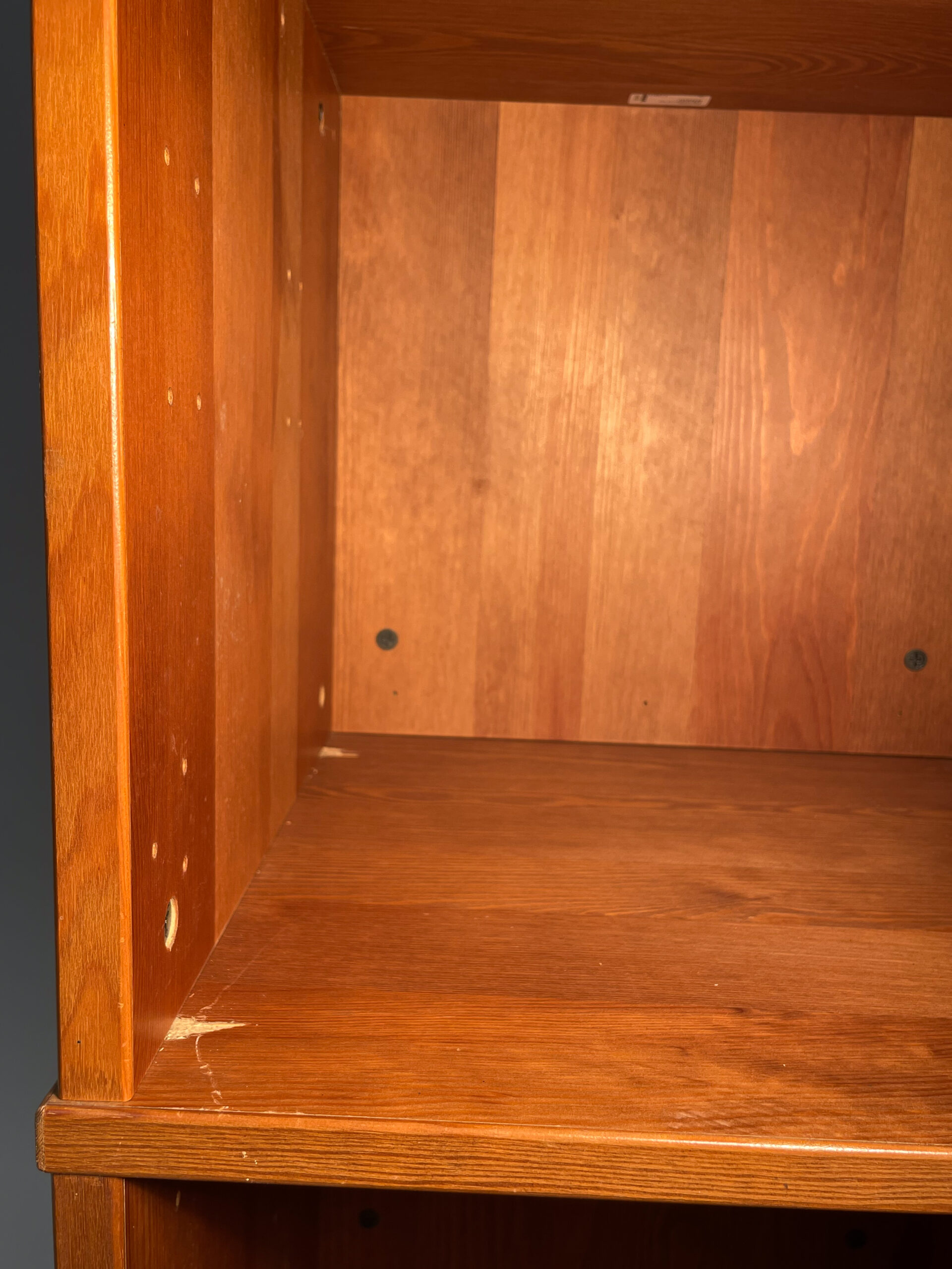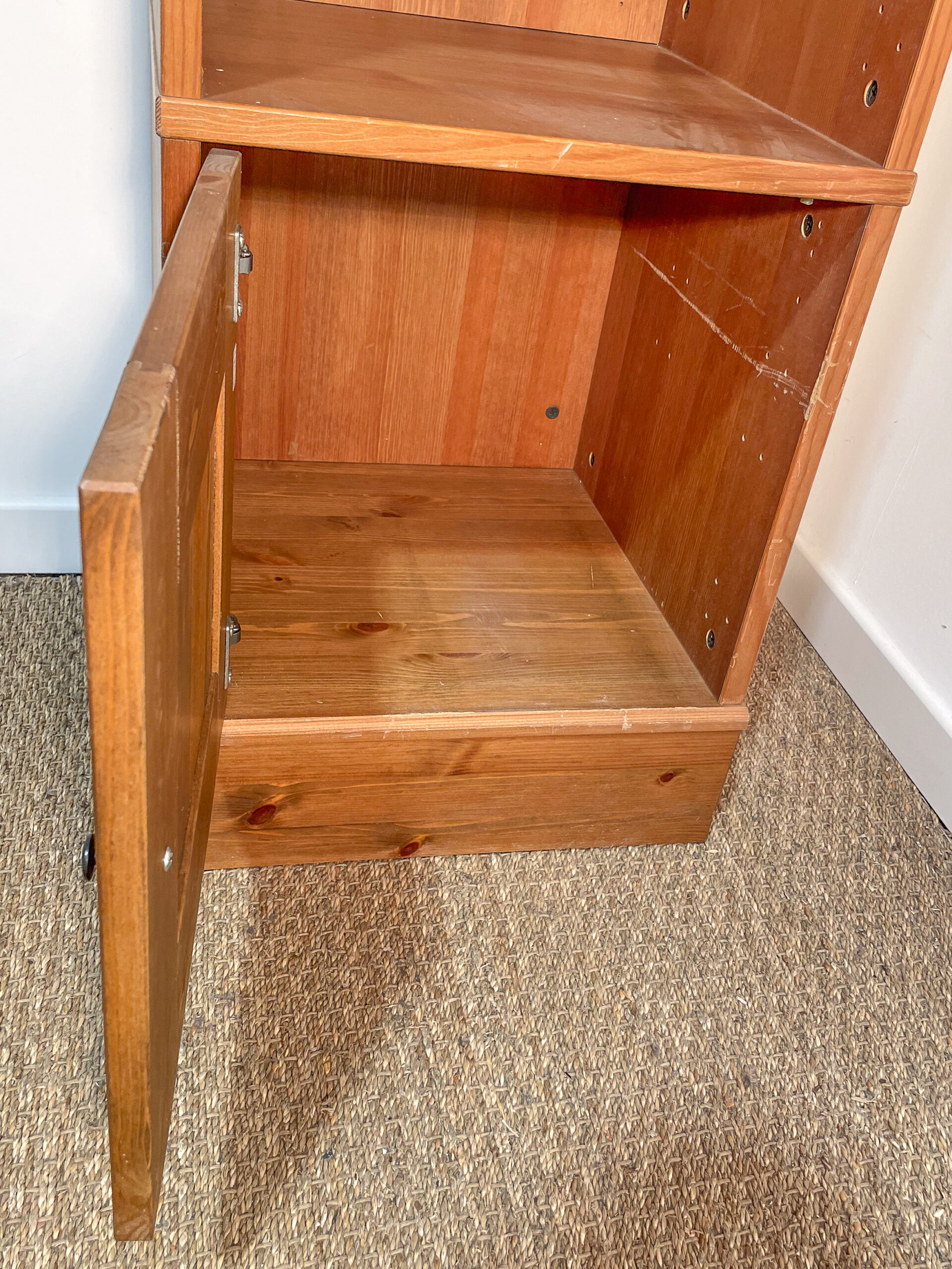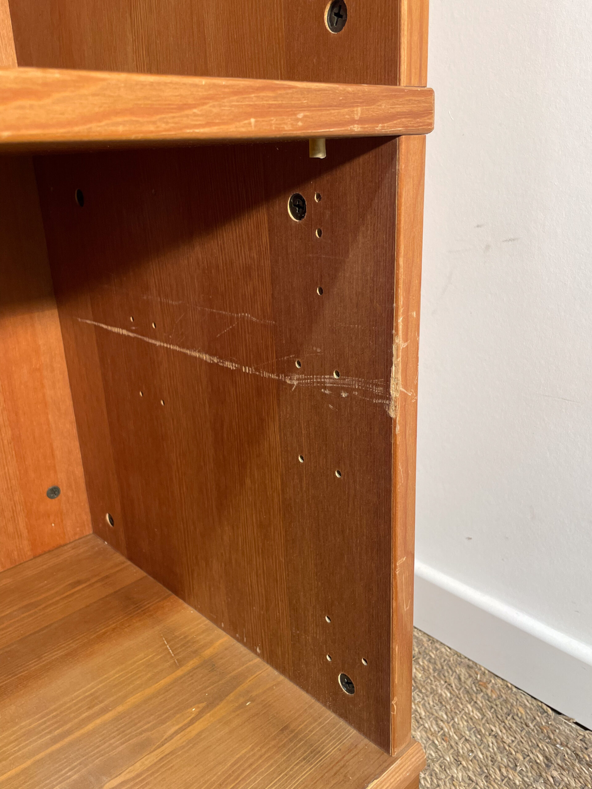 Le caisson supérieur a été endommagé (voir éclat dans le bois au niveau des 2 vis), cela n’impacte pas sa stabilité puisqu les 2 vis de l’autre côté sont toujours en place et qu’il a, en plus, été renforcé par 2 réglettes métallique à l’arrière du meuble (pour que cela reste invisible). Il faut simplement veiller à ne pas le tirer par le caisson du haut lors d’une manutention par exemple.
