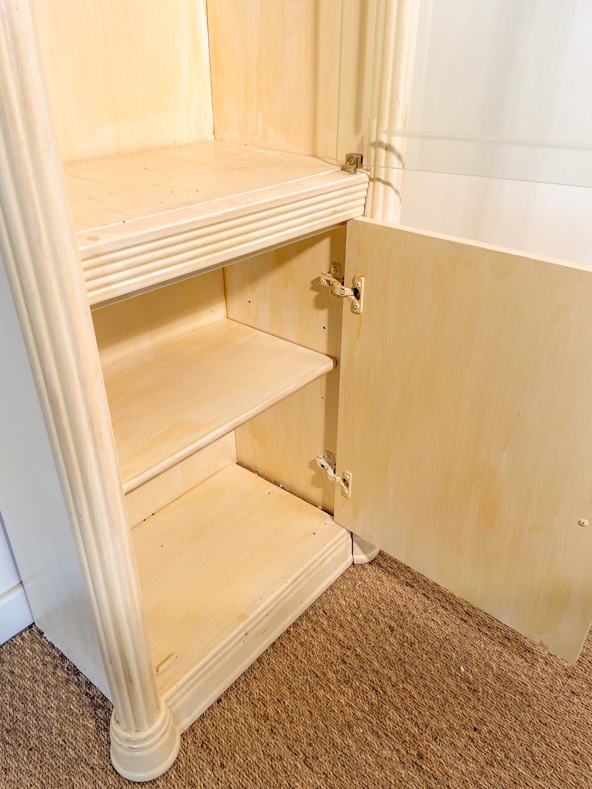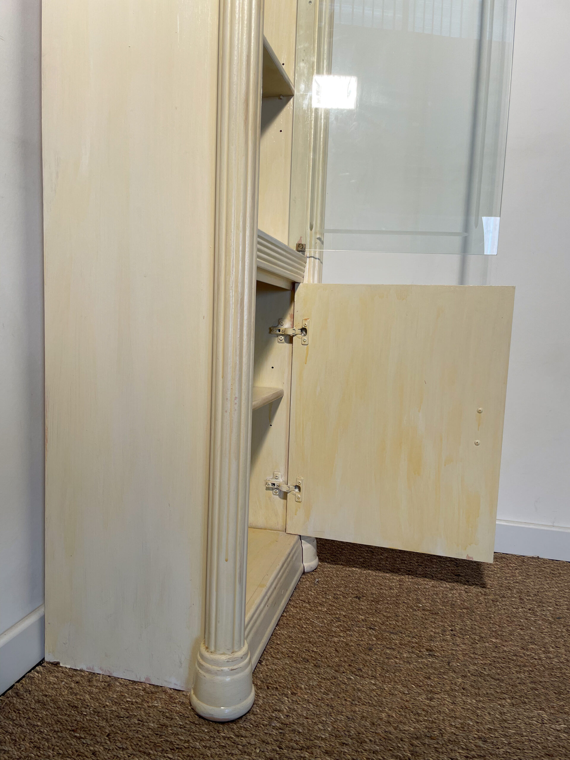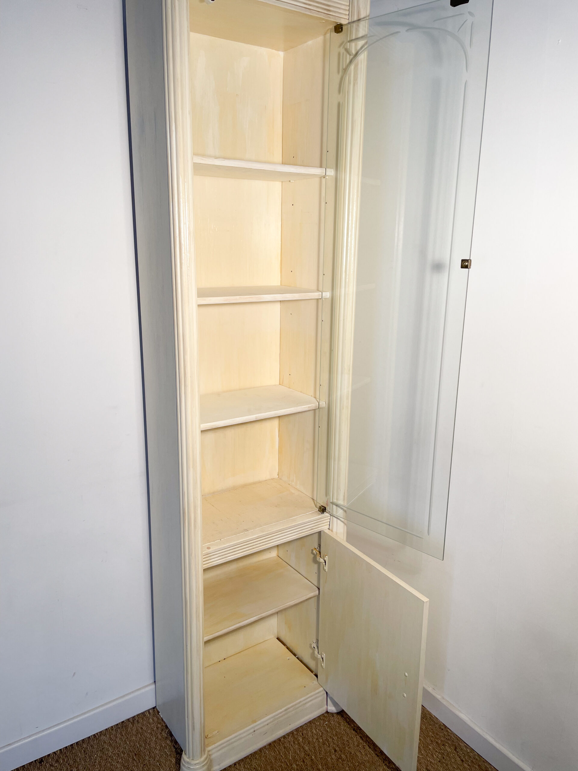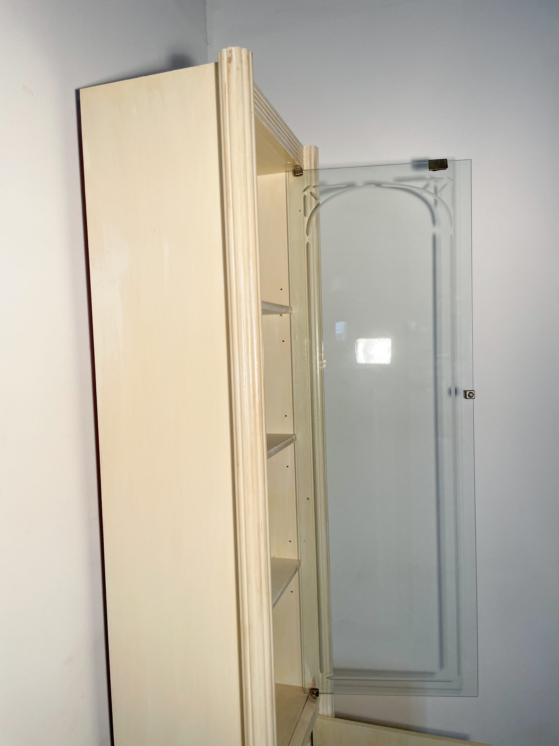Grande bibliothèque haute vintage avec détails arrondis et une porte vitrée.