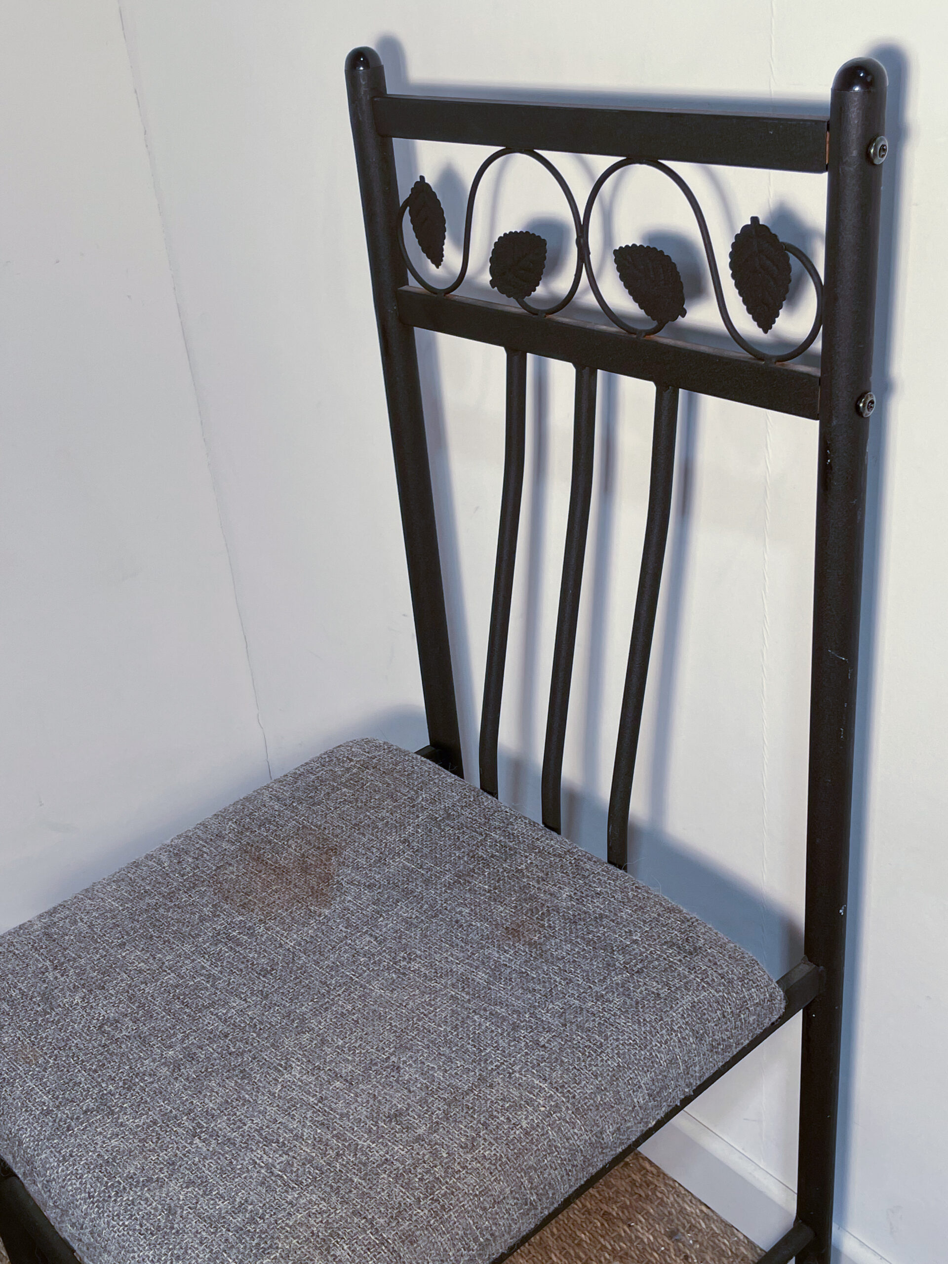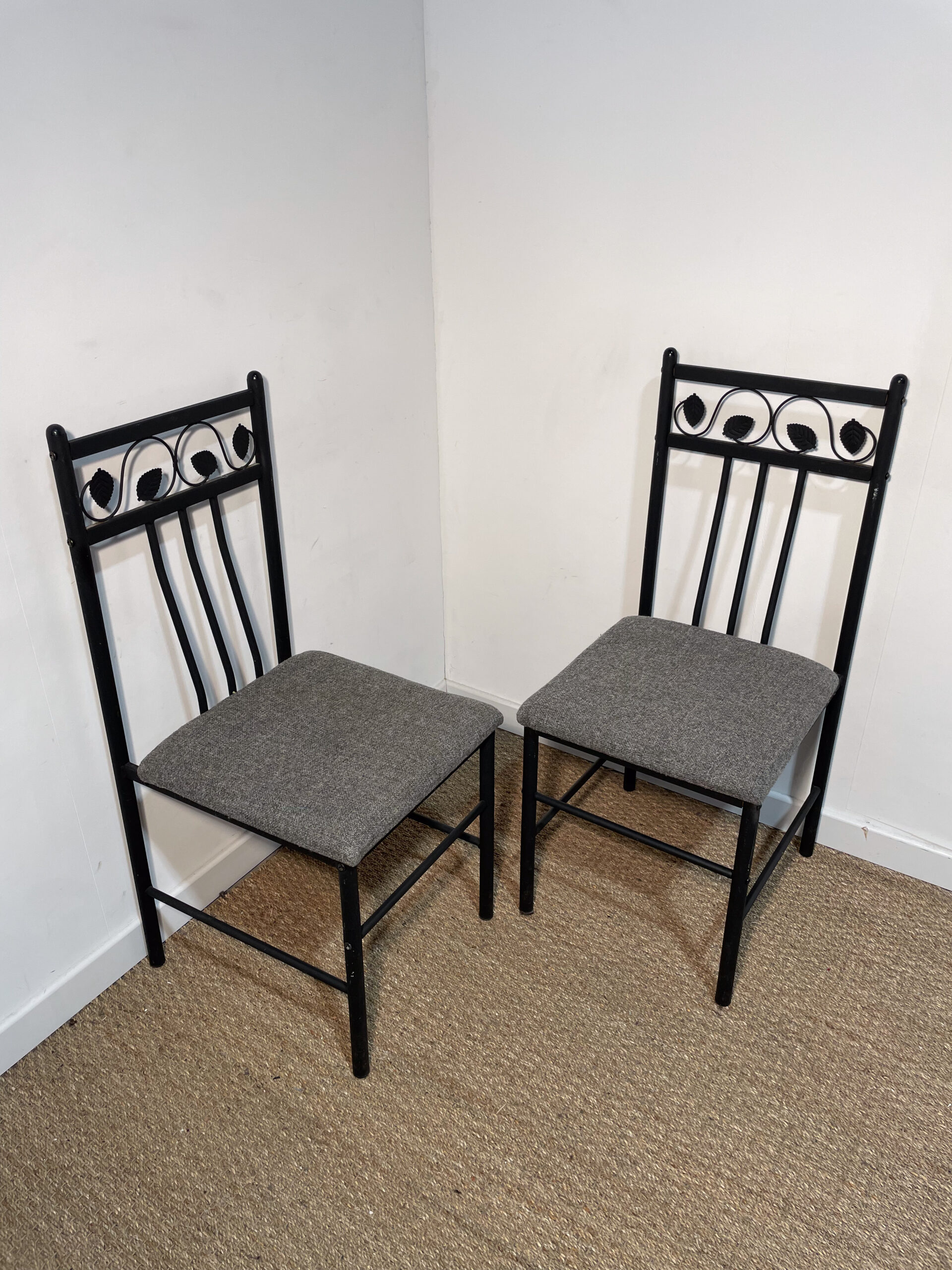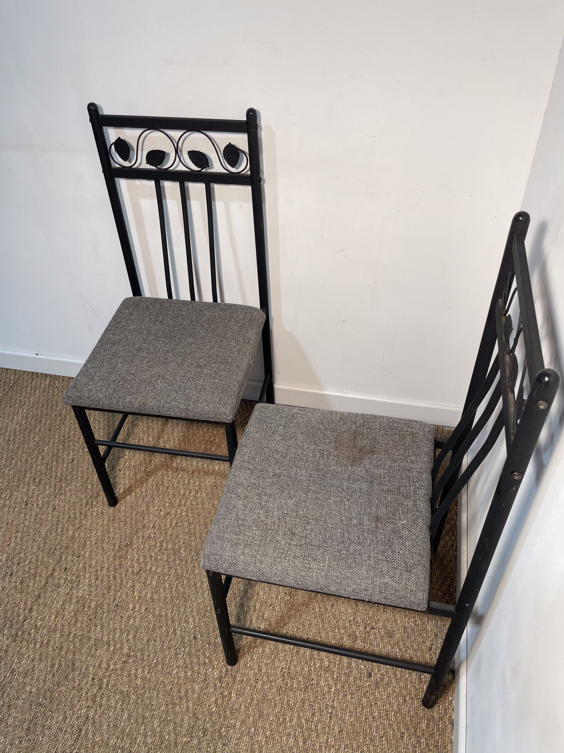 Lot de 4 chaises en fer forgé gris avec assise en tissu gris foncé et détails de feuillage sur les dossiers.