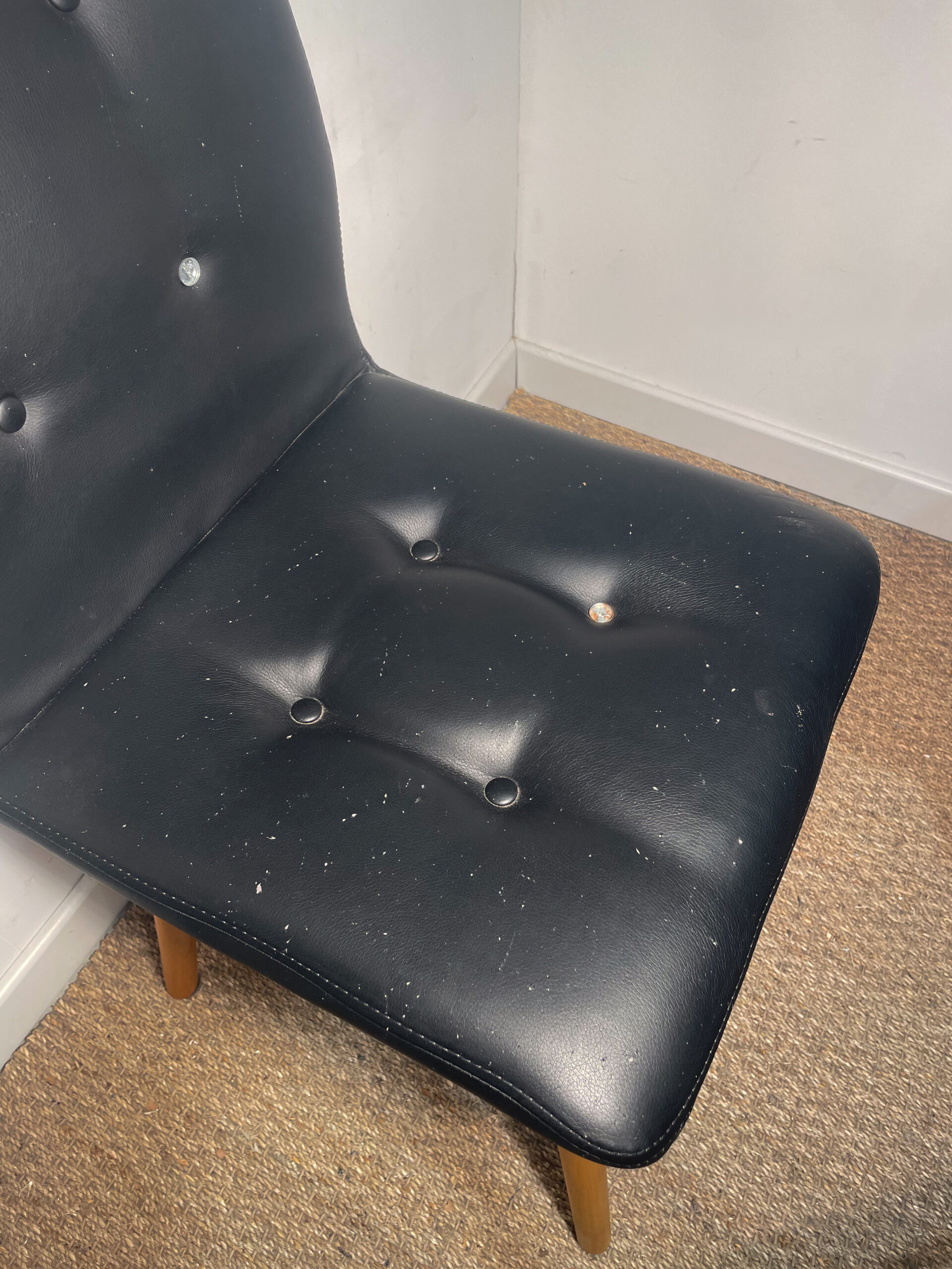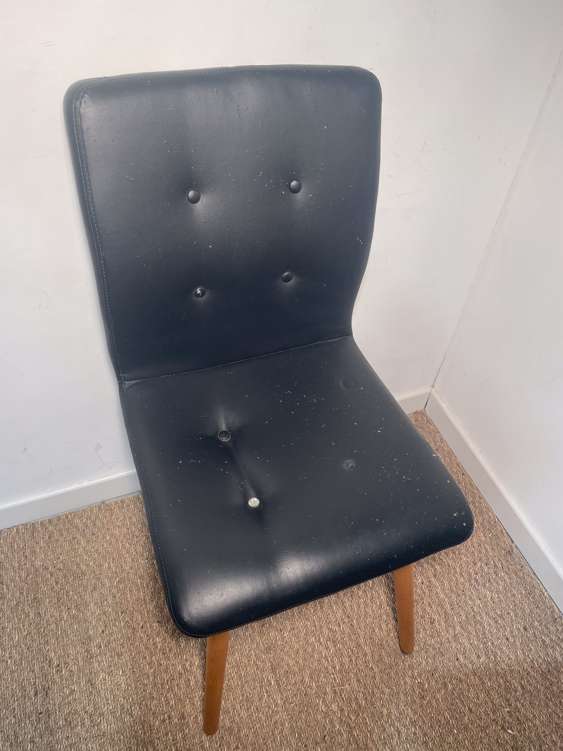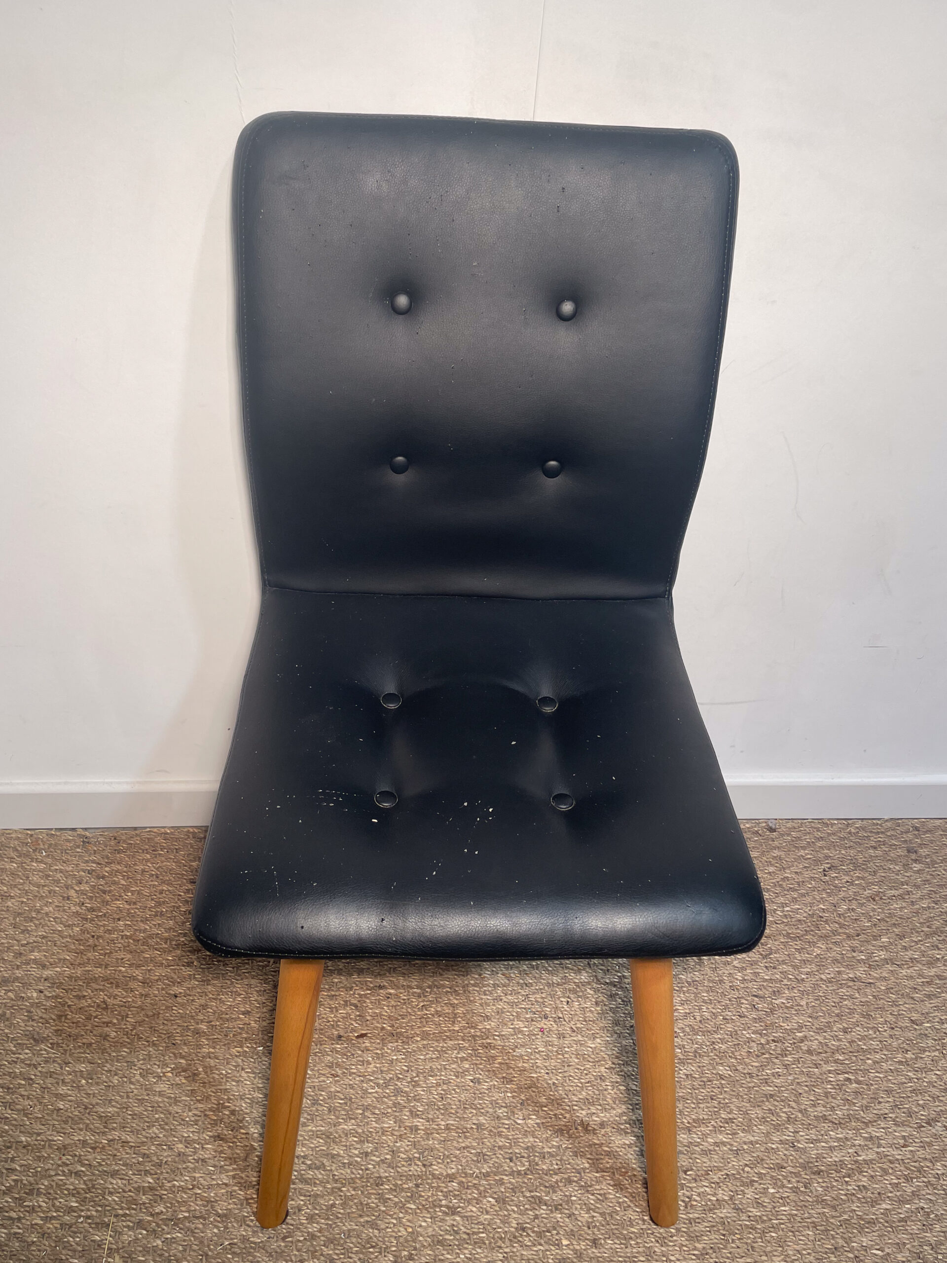 Le similicuir noir est très abimé sur l’ensemble des chaises, et il manque des boutons sur 2 d’entre elles. Il s’agit d’un lot à réparer par exemple en changeant les housses.