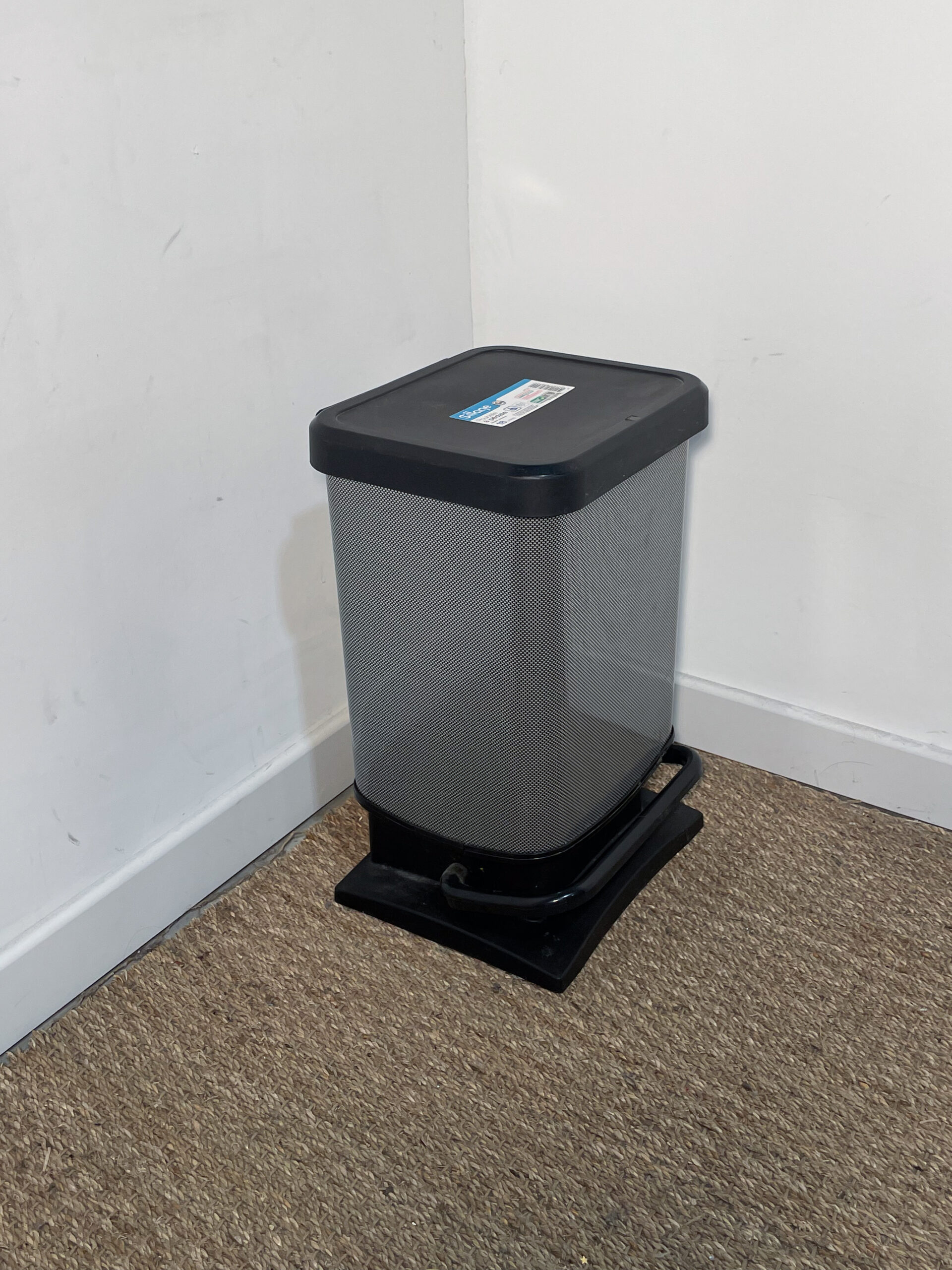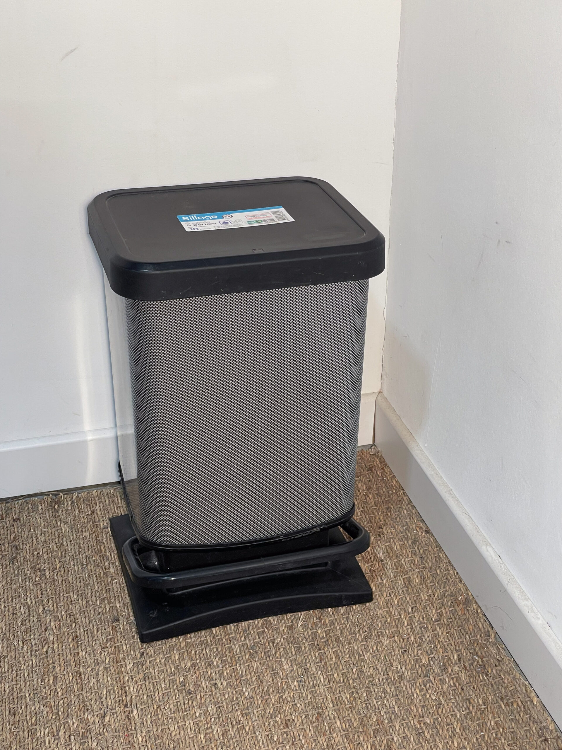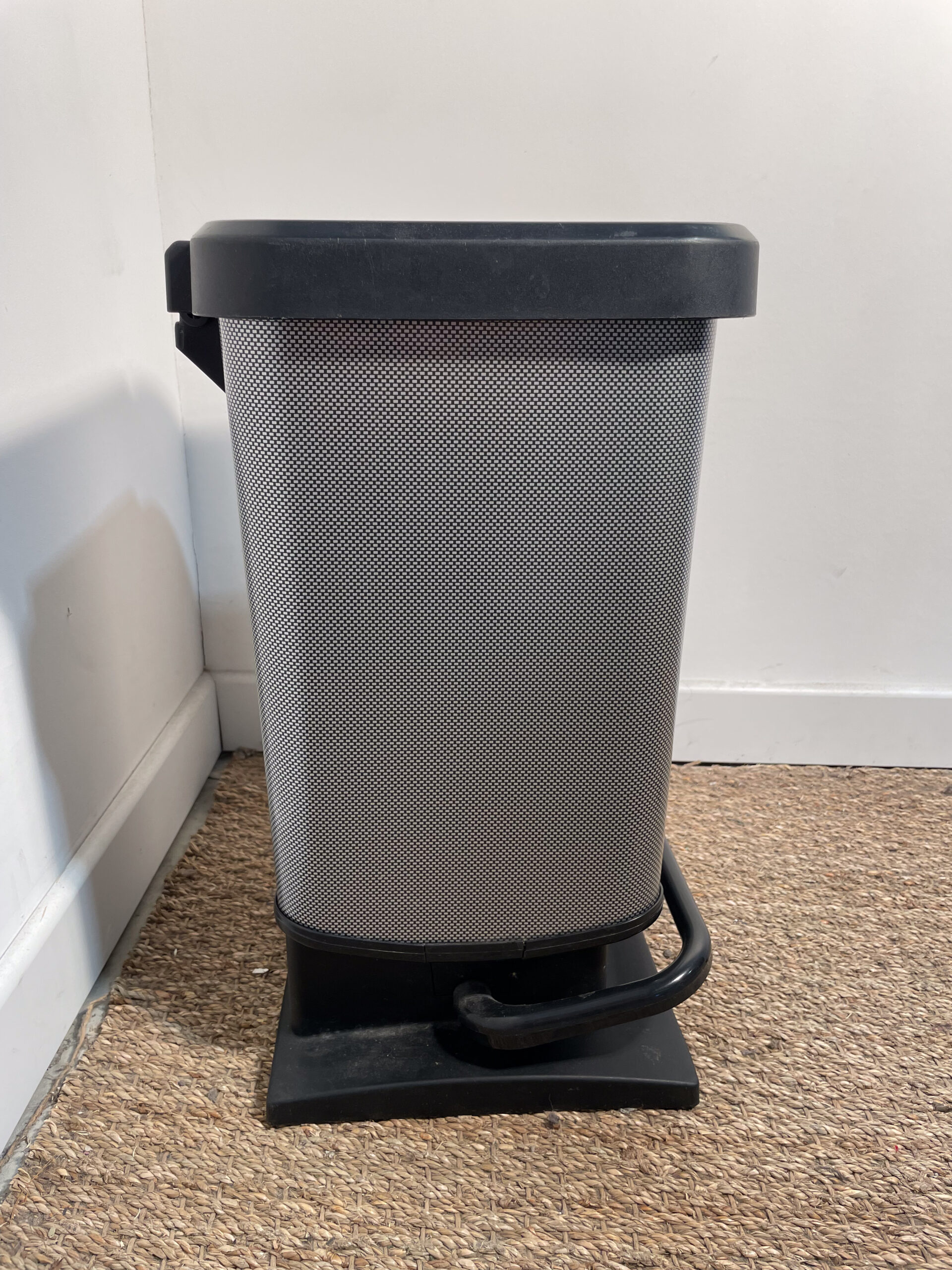 Petite poubelle en plastique (18L) noir et gris avec système d’ouverture par pédale.