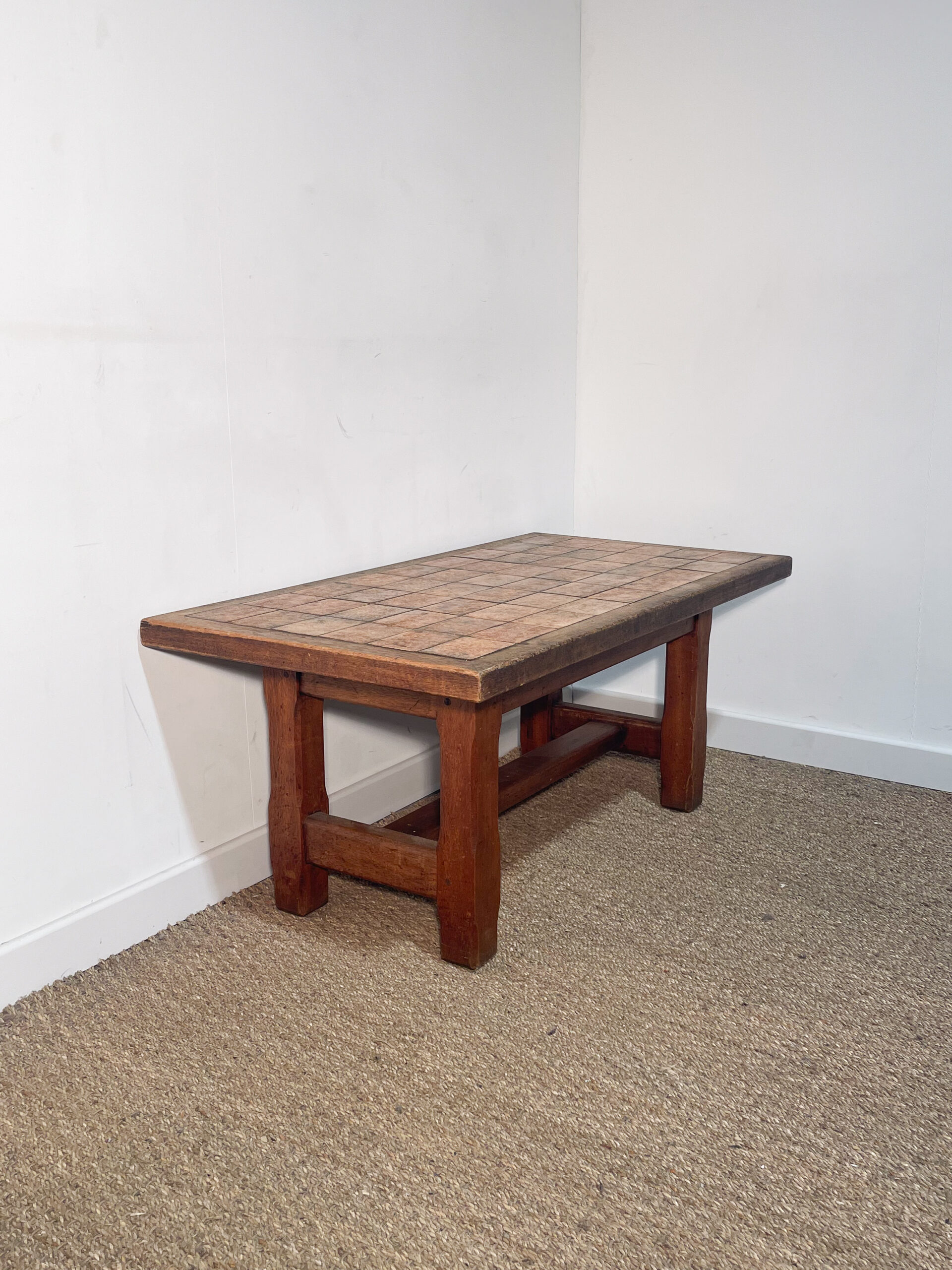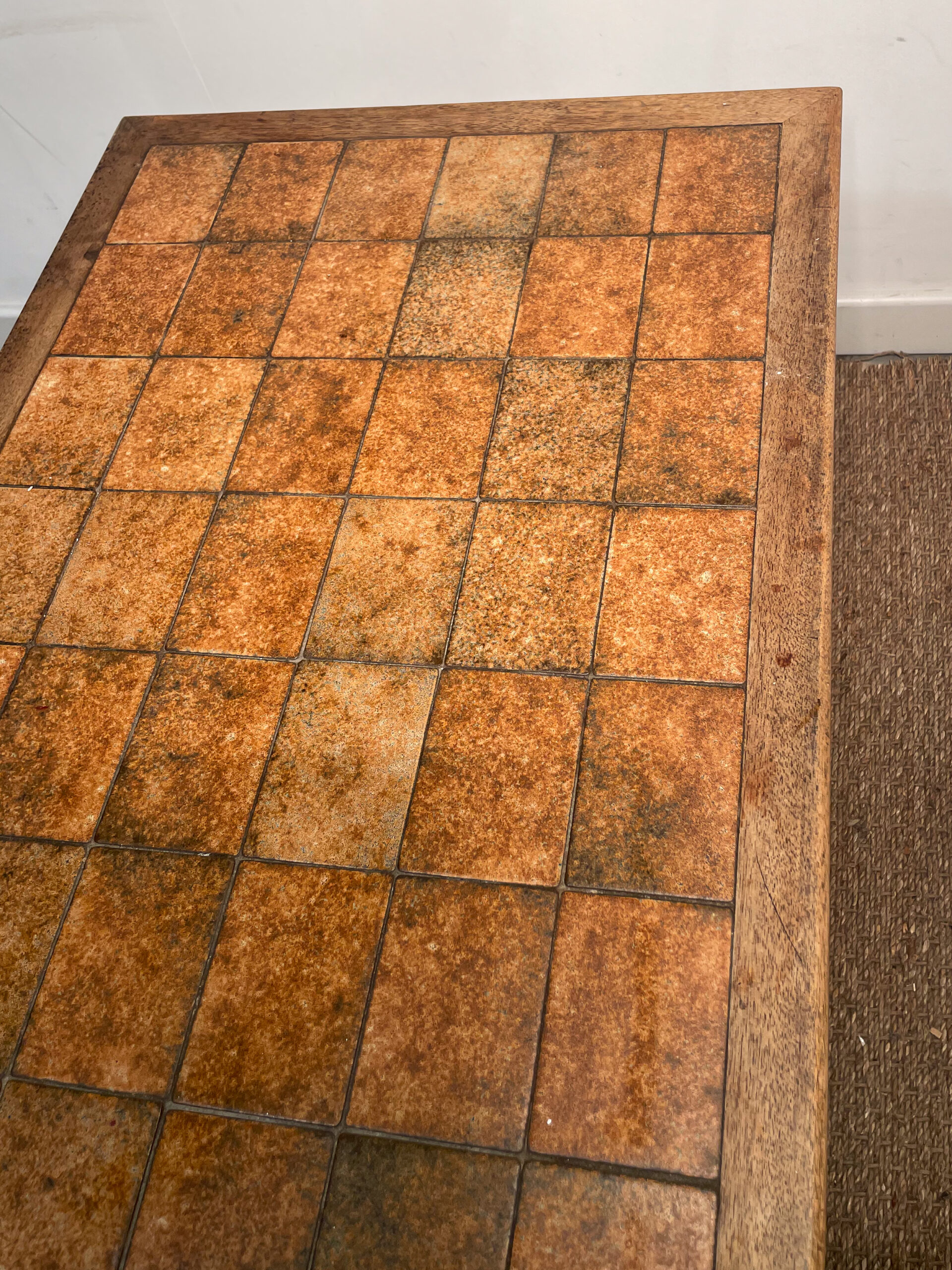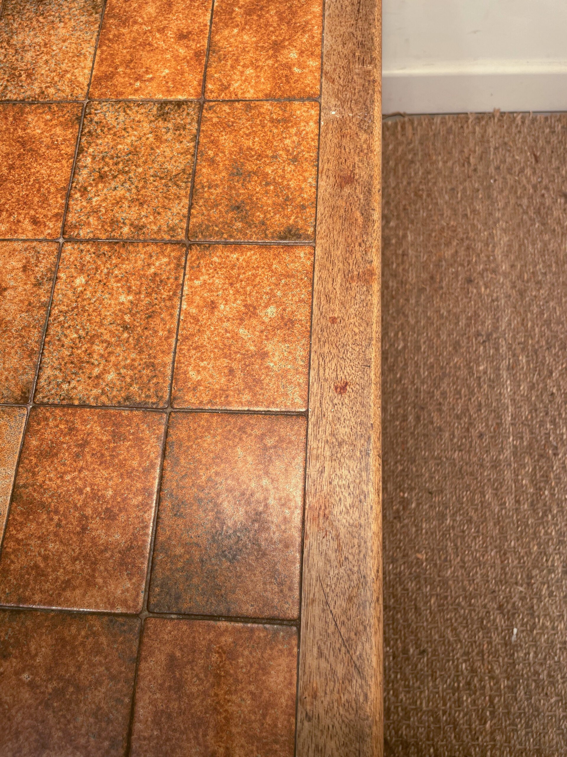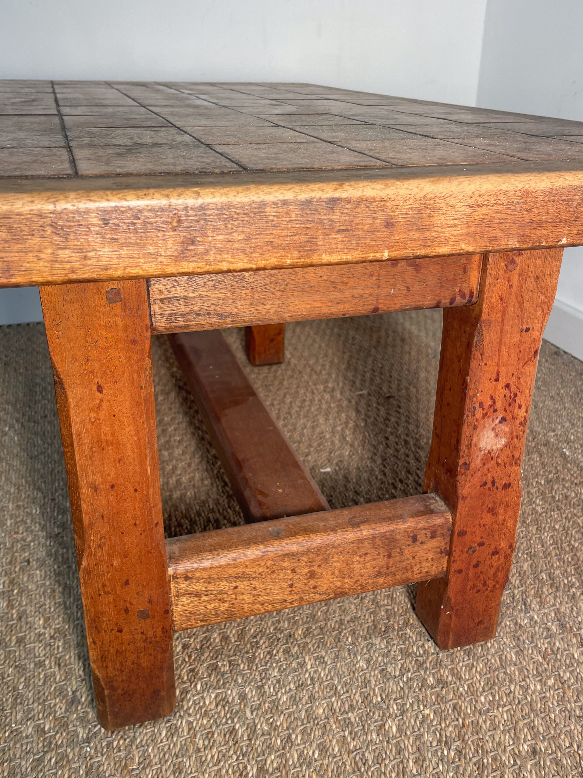 Le bois présente des marques d’usure et tâches sur l’ensemble, notamment sur les contours du plateau et les pieds : voir photos.