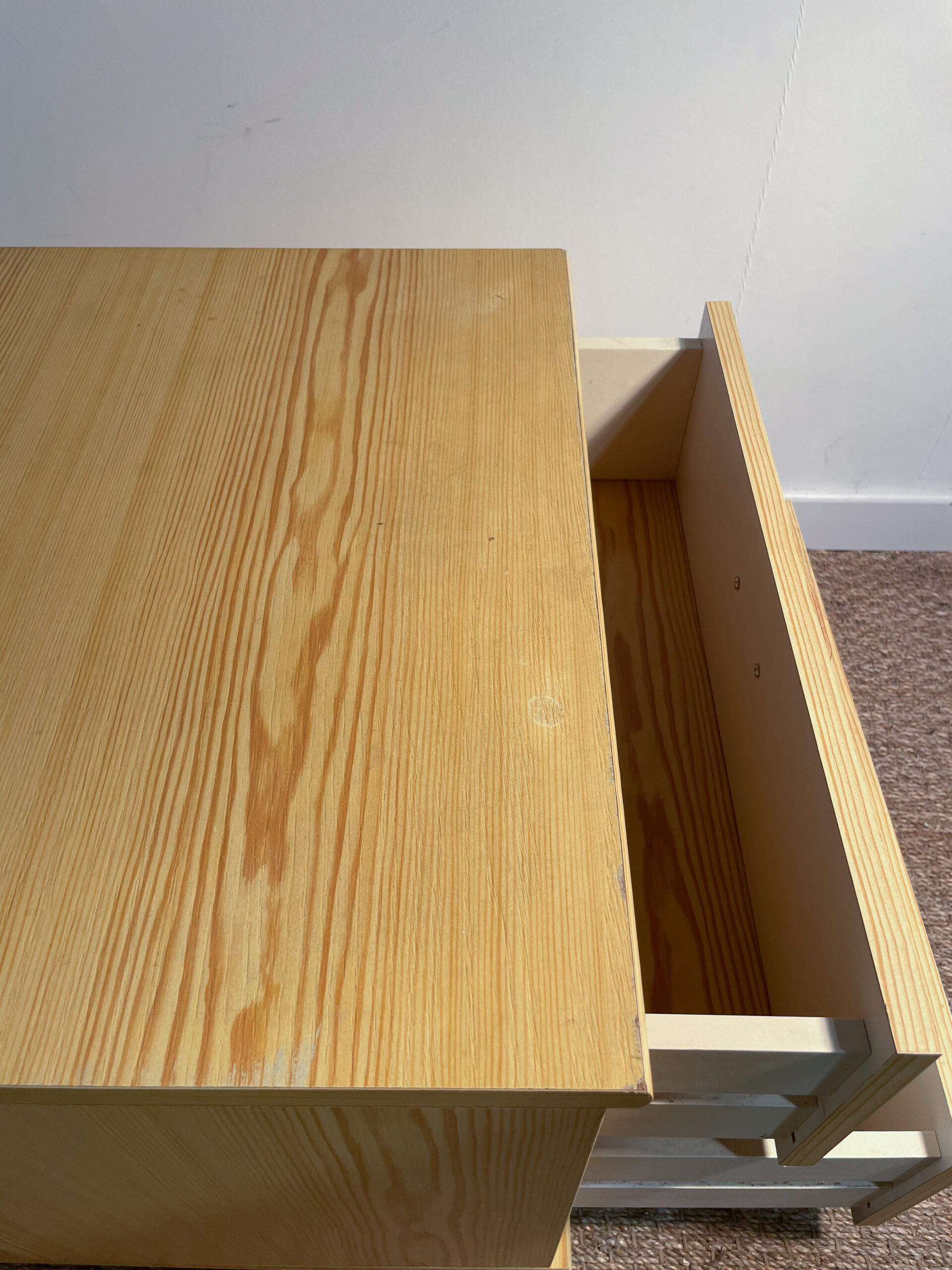 Table de chevet en bois clair avec 2 tiroirs blancs.