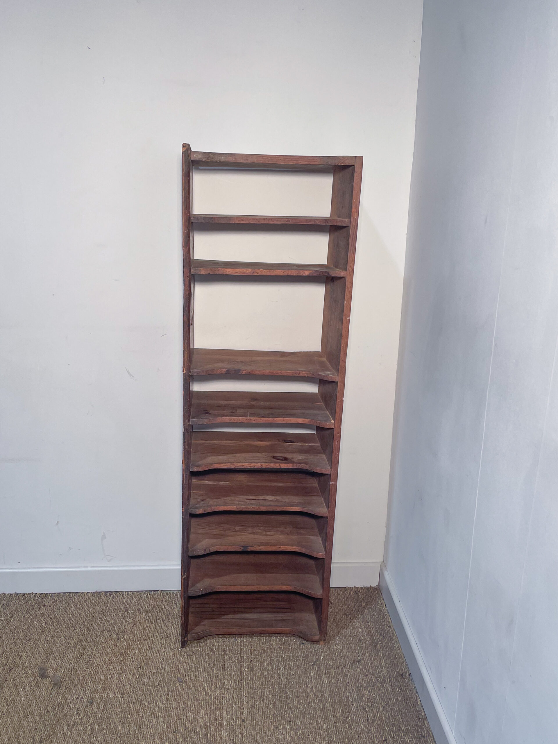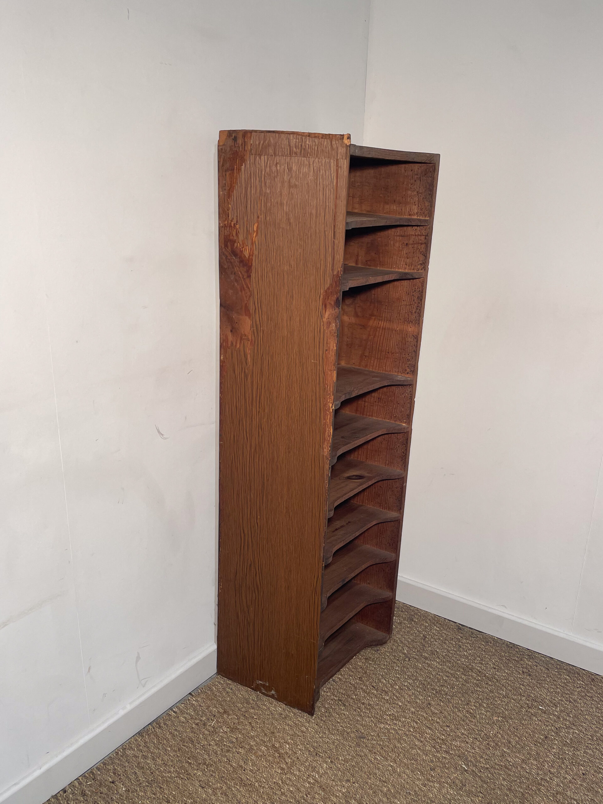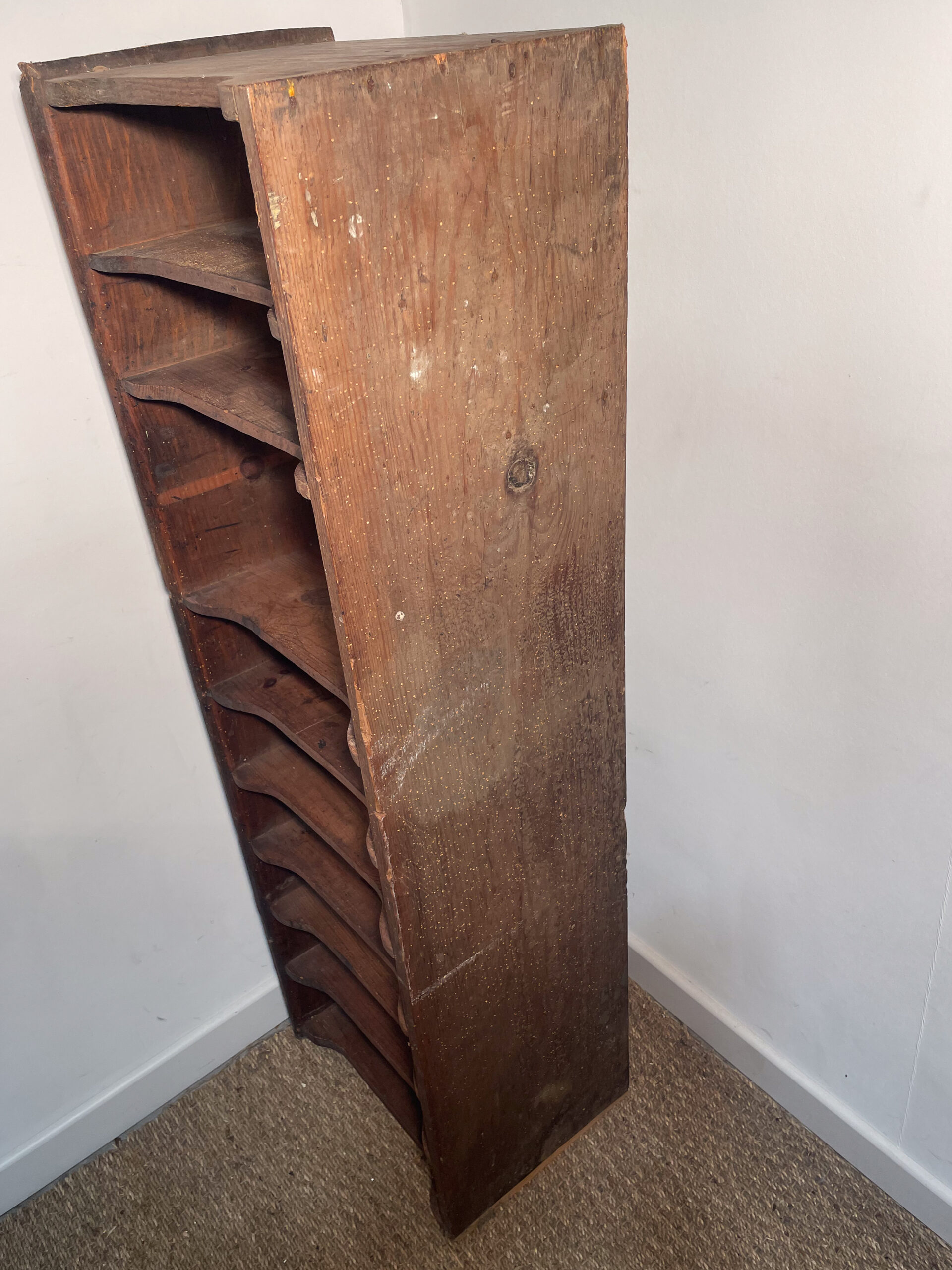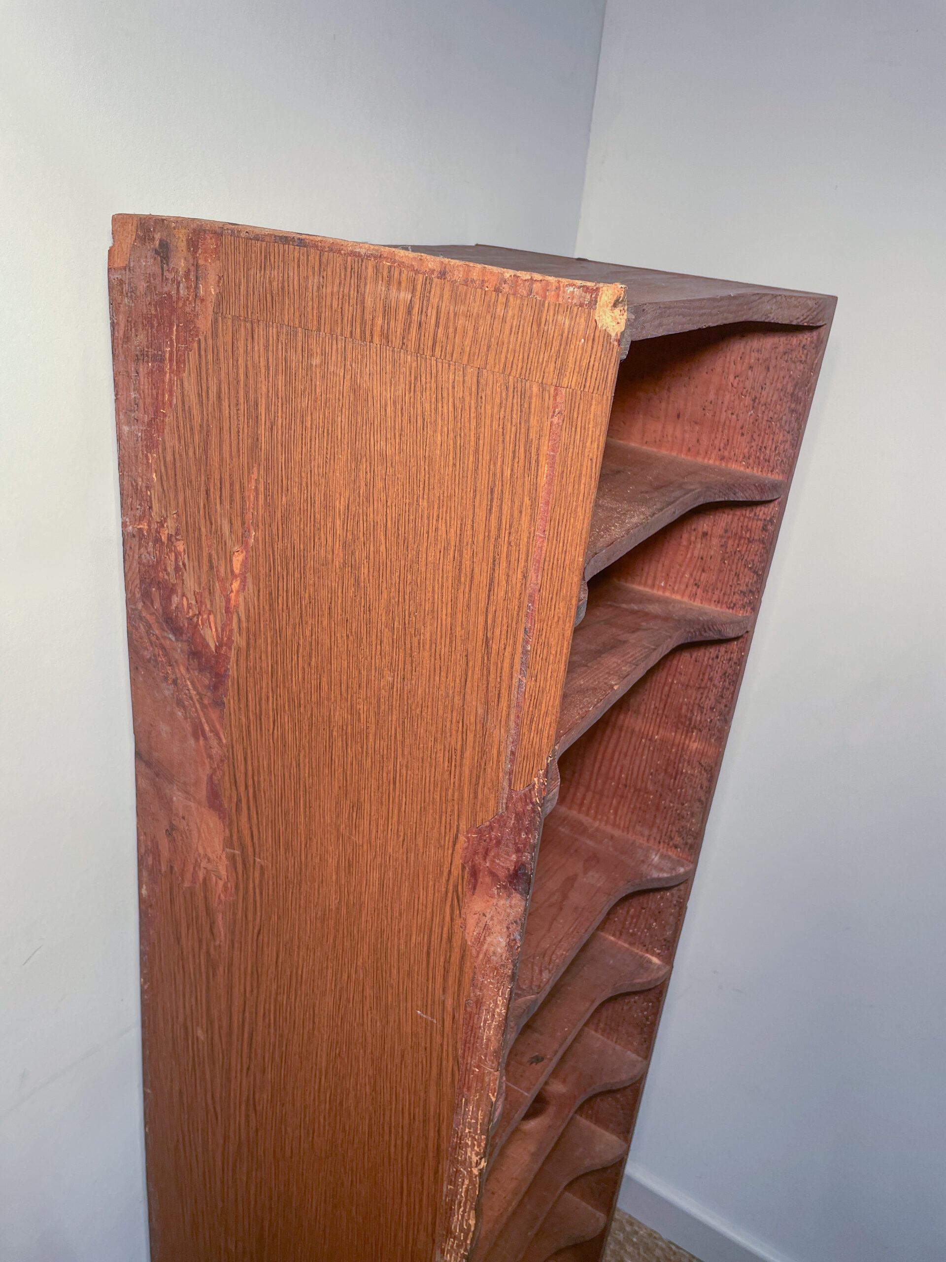 Tour de rangement en bois foncé à différentes niveaux.