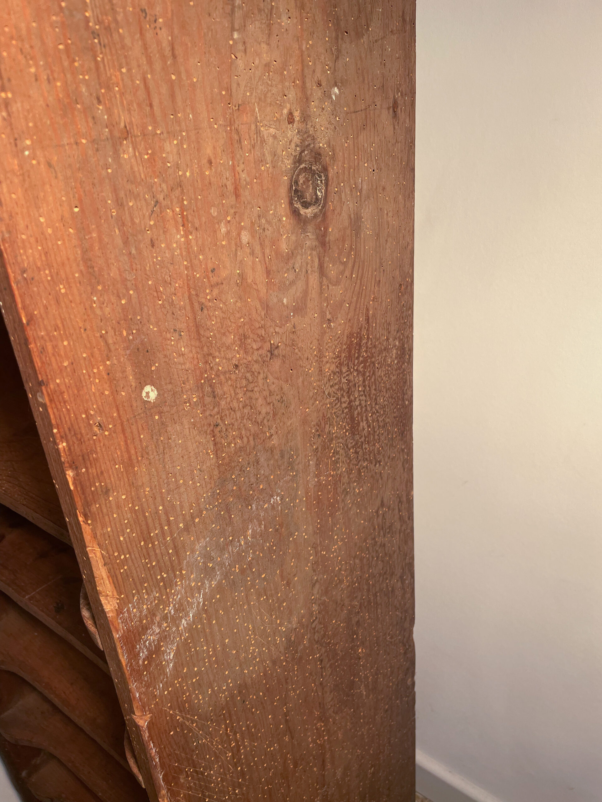 Le bois est très abimé sur tout l’ensemble (griffures, trous) , et le revêtement est quasi complètement arraché : idéal à retaper !